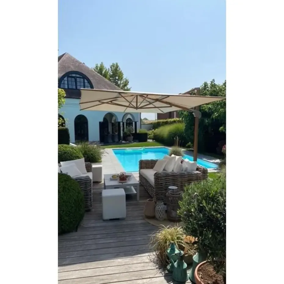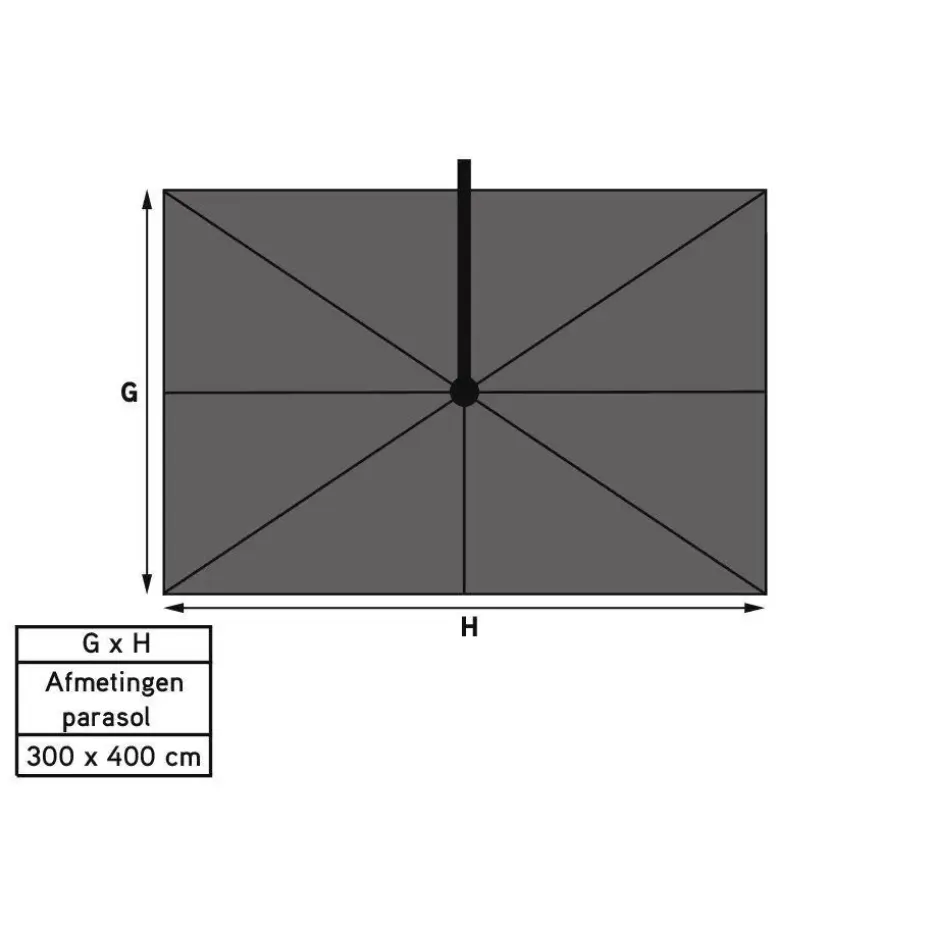 Deze Hacienda parasol wordt geleverd exclusief parasolvoet en exclusief parasolhoes. Wij raden u aan om minstens een 120 kg. parasolvoet te gebruiken.