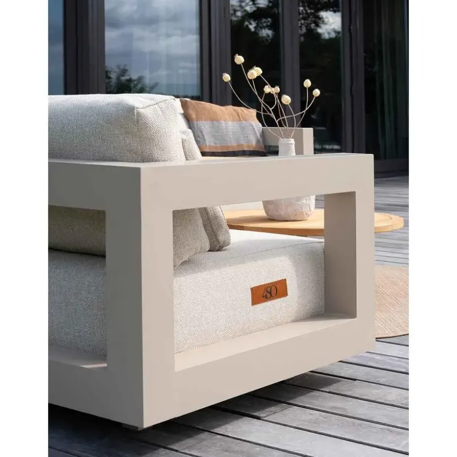 Het sterke frame van de Metropolitan loungebank is gemaakt van aluminium. Dit aluminium is voorzien van een mooie latte kleurige poedercoating. Aluminium heeft als voordeel dat het licht van gewicht is en onderhoudsvrij. Aluminium kun je eenvoudig met een sopje van groene zeep afnemen en daarna drogen met een pluisvrije doek.