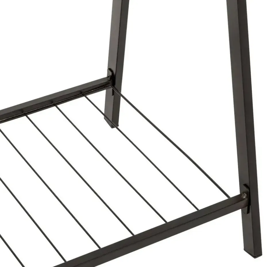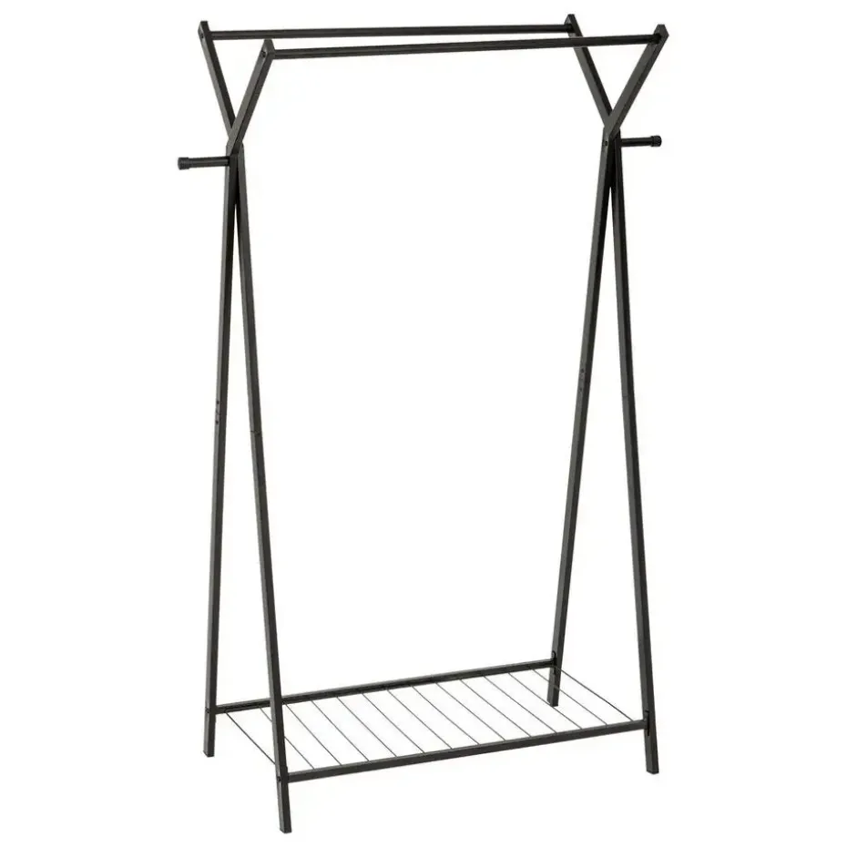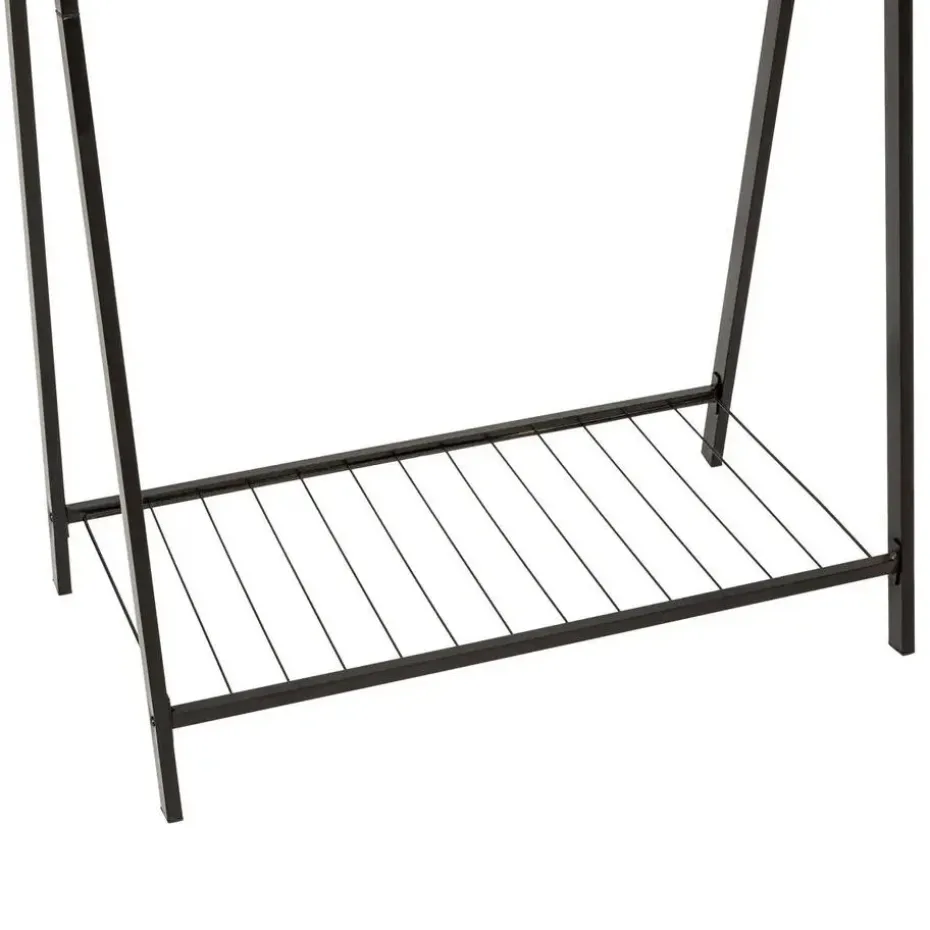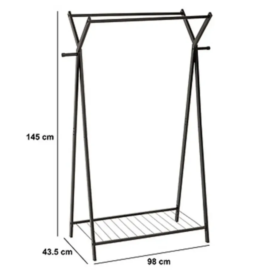 Kledingrek met dubbele hangkleding stang gemaakt van rvs metaal in de kleur zwart. Afmetingen: 98 x 42 x 145 cm. Dozen plank onderin en extra haken aan beide zijden. Zelf monteren. Draagvermogen maximaal 49 kilo. Handig robuust kledingrek voor slaapkamer en/of zolder. Extra opslagruimte voor hangkleding.