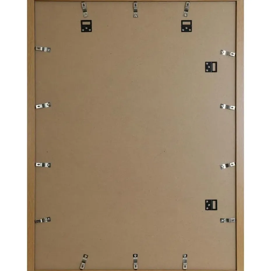 Dankzij deze houten lijst kan je je foto’s een plaatsje aan de muur geven. De fotolijst in eiken kleur is aan de achterkant voorzien van hangers waarmee je ze zowel horizontaal als verticaal tegen de muur kan bevestigen. Om het plexiglas te beschermen tijdens het transport, is het langs beide kanten van een folie voorzien. Deze folie is voor gebruik gemakkelijk te verwijderen.