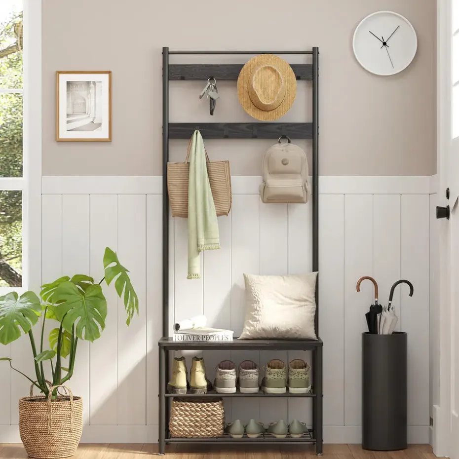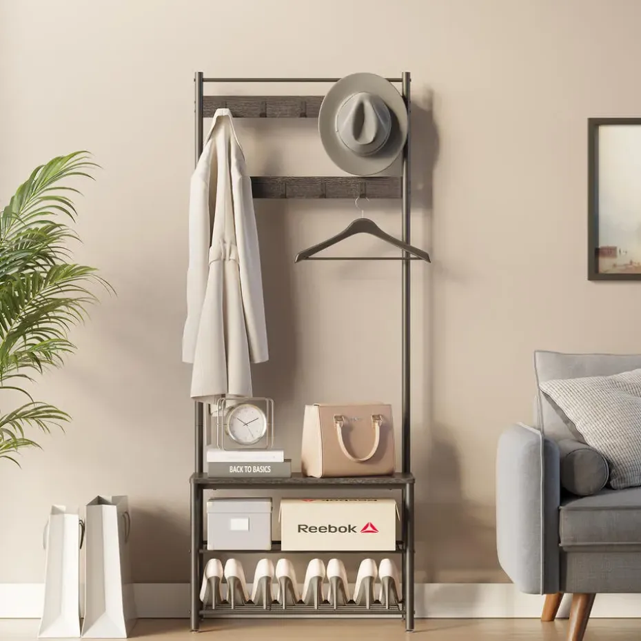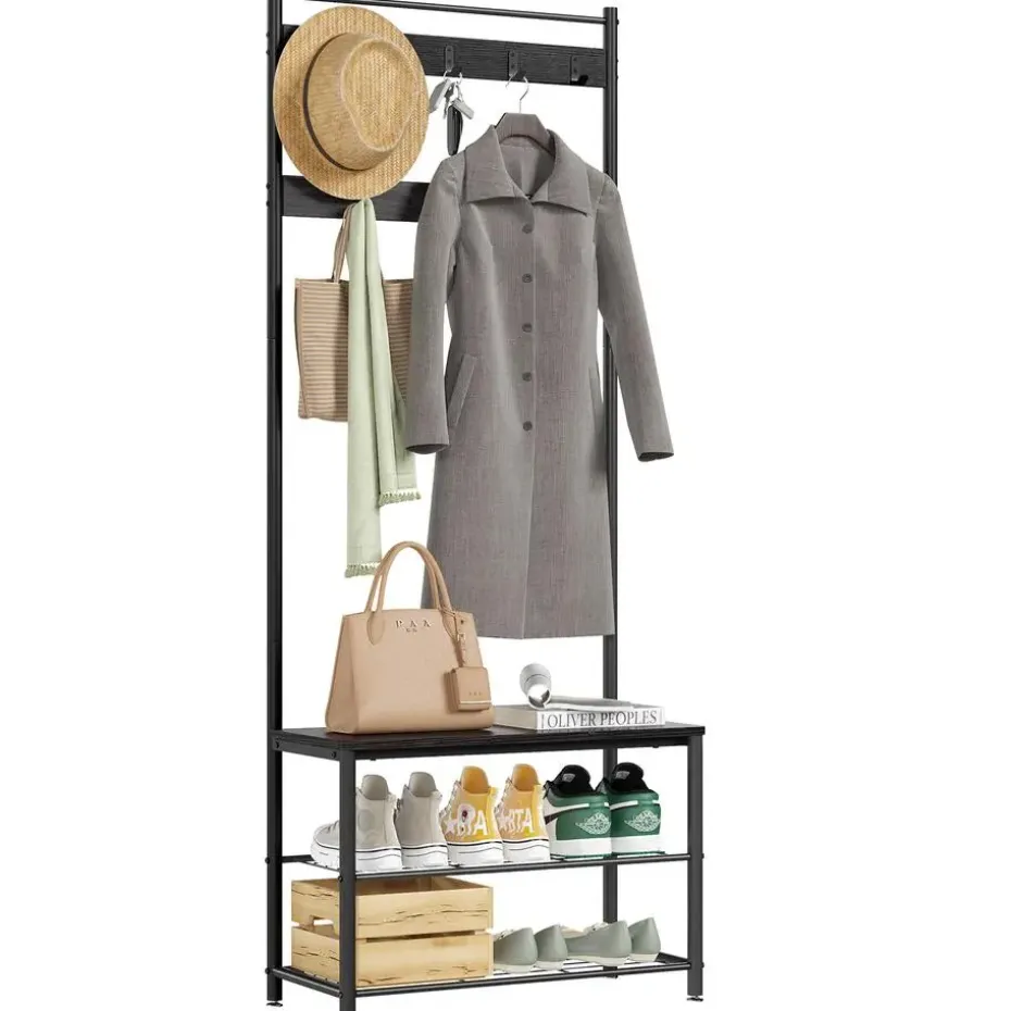 Naast de functie van kapstok beschikt dit kledingrek ook over een verzamelruimte voor schoenen. Twee metalen schappen voorzien u ruimte voor zo’n acht paar schoenen. Het gehele schoenenrek draagt tot 80 kg terwijl de haken elk 3 kg draagcapaciteit beschikken. Het spreekt voor zich dat dit type rek uitermate interessant is voor zij die houden van efficiëntie. Jassen en schoenen worden voortaan immers op één en dezelfde plaats verzameld.