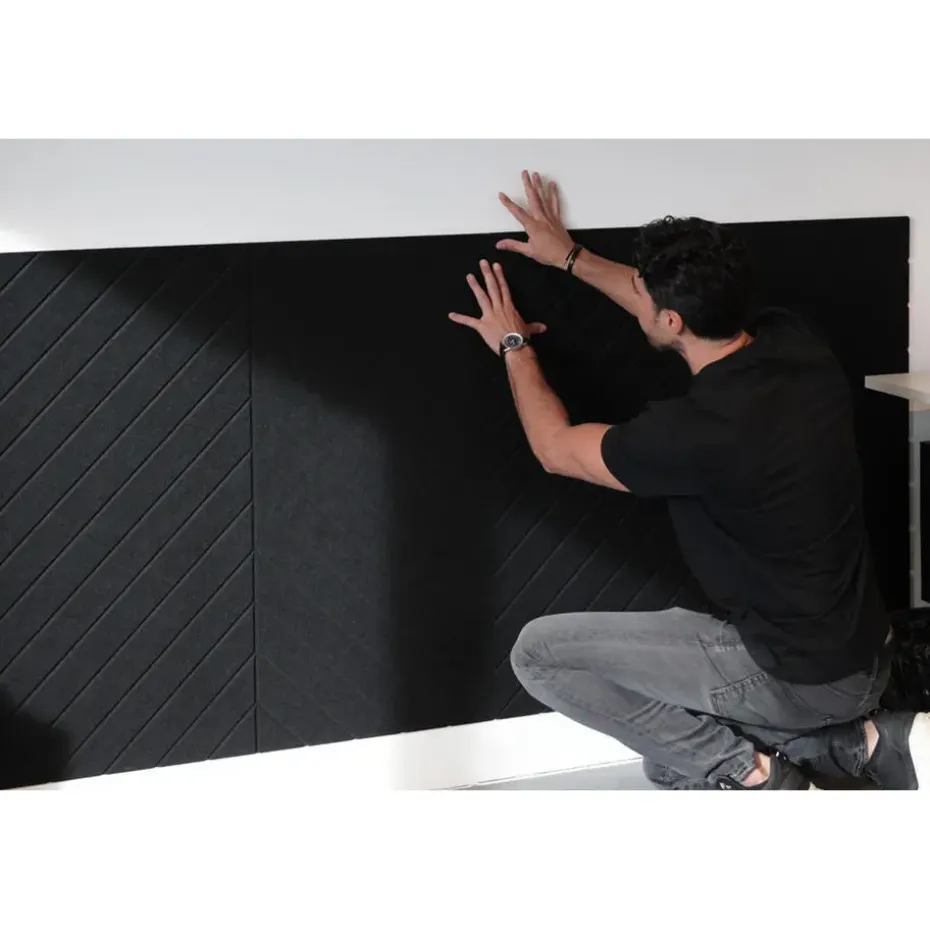 De PET-vilt panelen kunnen met dubbelzijdige tape of met MS-polymeerkit aan de muur bevestigd worden. Dit werkt het beste op gladde, stofvrije oppervlakken. Voor bevestiging aan het plafond adviseren wij het gebruik van kit.