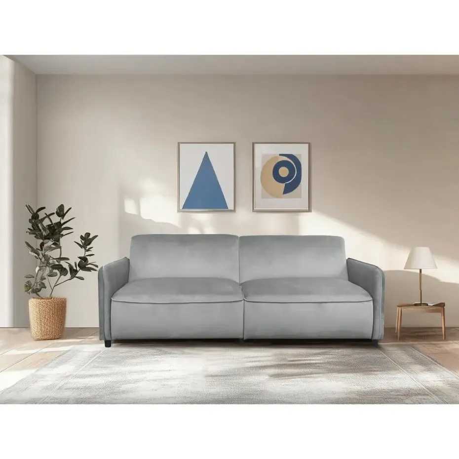 De elegante slaapbank met drie zitplaatsen, bekleed met luxueuze zachte fluweelstof, is perfect voor elke woonkamer, logeerkamer of thuiskantoor. Het voegt een vleugje verfijning toe aan je interieur. Deze handmatig verstelbare slaapbank verandert moeiteloos in een extra slaapplaats, ideaal voor het ontvangen van logés. Je kunt eenvoudig je favoriete positie instellen in slechts een paar stappen. De matras, met een afmeting van ongeveer 110 × 190 cm, bevat steunpoten die slim in de rugleuning zijn verborgen voor extra stabiliteit. Elke zitplaats kan een maximale belasting van 135 kilogram dragen. In gemonteerde toestand zijn de afmetingen van de slaapbank ongeveer 209 × 91 × 80 cm. Het product is FSC®-gecertificeerd.