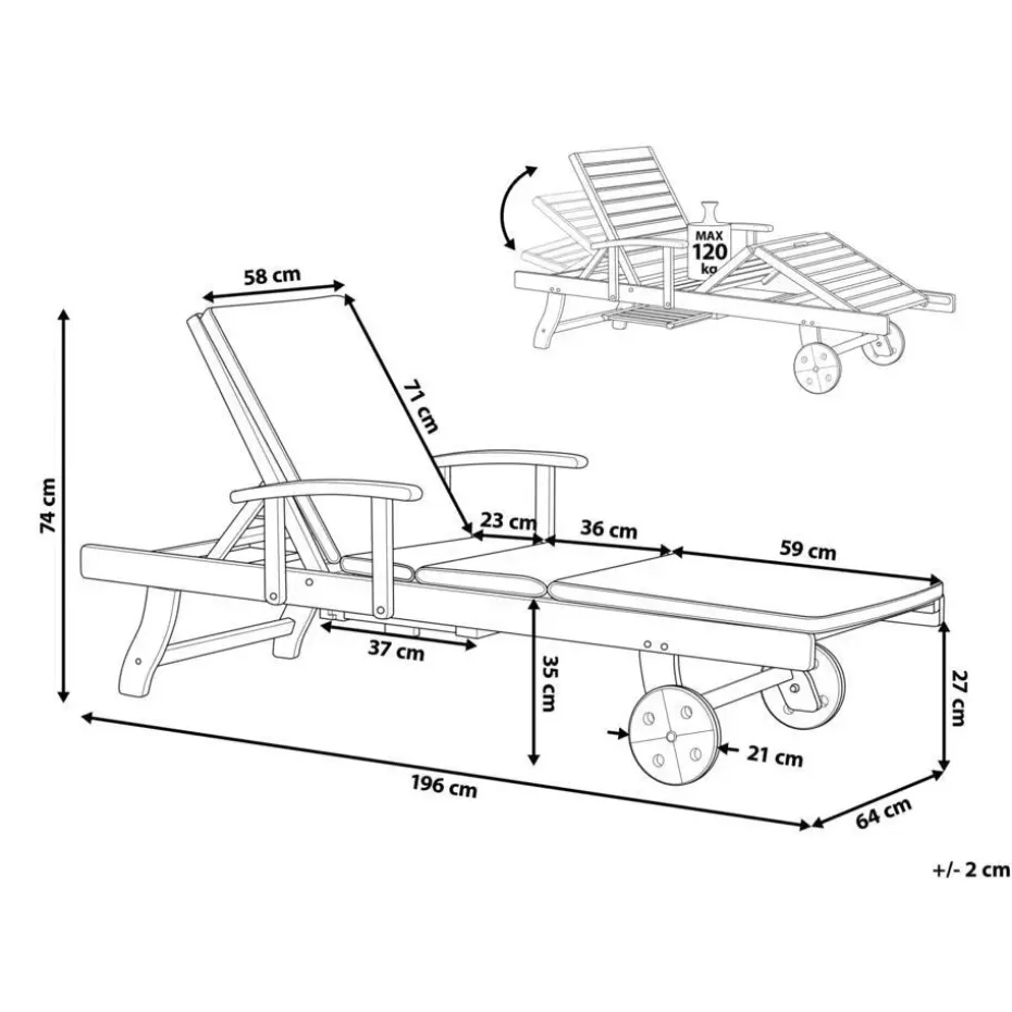 Belangrijkste eigenschappen: Rugleuning in 4 posities verstelbaar, Praktische touwtjes voor gemakkelijke bevestiging aan de zitting, Speciaal gemaakt voor gebruik buitenshuis, Robuuste constructie van het frame, Gemaakt van natuurlijk resistente materialen, Waterproof, Oeko-Tex® Standaard 100 Gecertificeerd, Om de kwaliteit te behouden, moet het beschermd worden tegen water en regen, UV-bestendigheidsklasse 5 (ISO 105-B02)