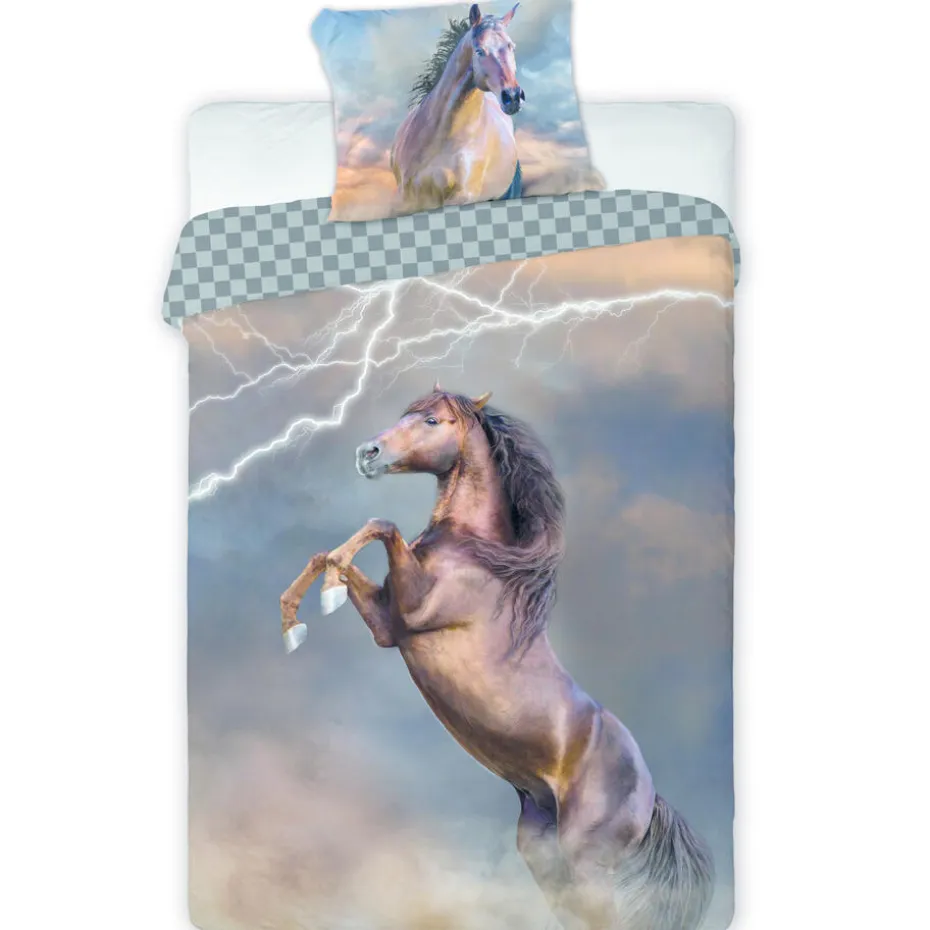Animal Pictures Dekbedovertrek, Lightning. Een mooi katoenen dekbedovertrek van een steigerend paard. Op de achtergrond zie je een bliksemschicht. Dat is nog eens een krachtig beeld! Mooi voor op elke slaapkamer en een musthave voor elke paardenliefhebber. De achterzijde van het overtrek is voorzien van een ruitpatroon, wat een leuk effect geeft als je het dekbed een stukje openslaat bij het opmaken. Samen met het extra grote kussensloop heb je een echte blikvanger in huis en een geweldig cadeau-idee voor elke fan van paarden!