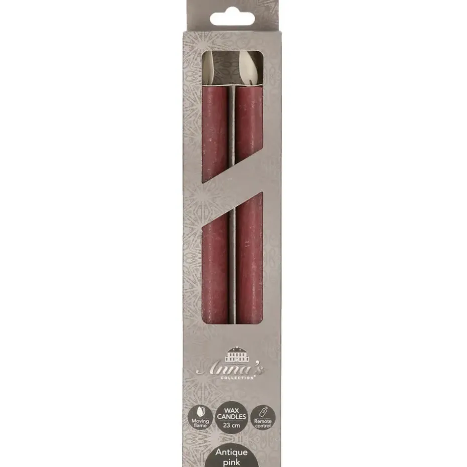Prachtige LED dinerkaarsen in de kleur antiek roze. Deze set bestaat uit 2 stuks kaarsen, elk 23 cm hoog, die u gemakkelijk kunt bedienen met de bijgeleverde afstandsbediening. De kaarsen hebben een rustieke uitstraling door de bewegende vlam en warme gloed. Voeding per kaars: 2 AA batterijen (niet inbegrepen). Kleur licht: warm wit. – rustieke uitstraling- bewegende vlam- inclusief afstandsbediening- warm wit licht