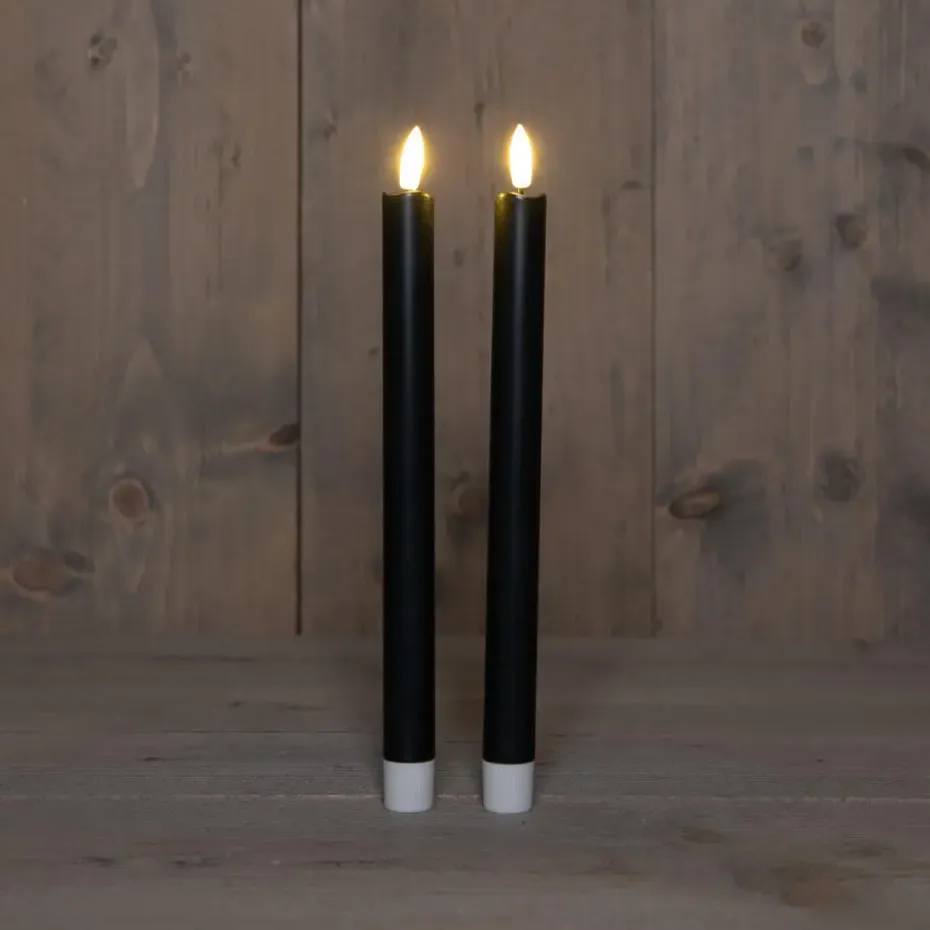 LED dinerkaarsen 2x stuks in de kleur zwart. De kaarsen zijn ongeveer 24 cm lang en geven een warm wit licht. Deze kaarsen zijn ideaal als decoratie voor elke speciale gelegenheid. Ze geven een warm, rustgevend licht en zijn veilig in gebruik. Deze LED dinerkaarsen zijn perfect om uw tafel een aangename sfeer te geven. Met 3D lont. Voeding per kaars: 2 AAA batterijen (niet inbegrepen).