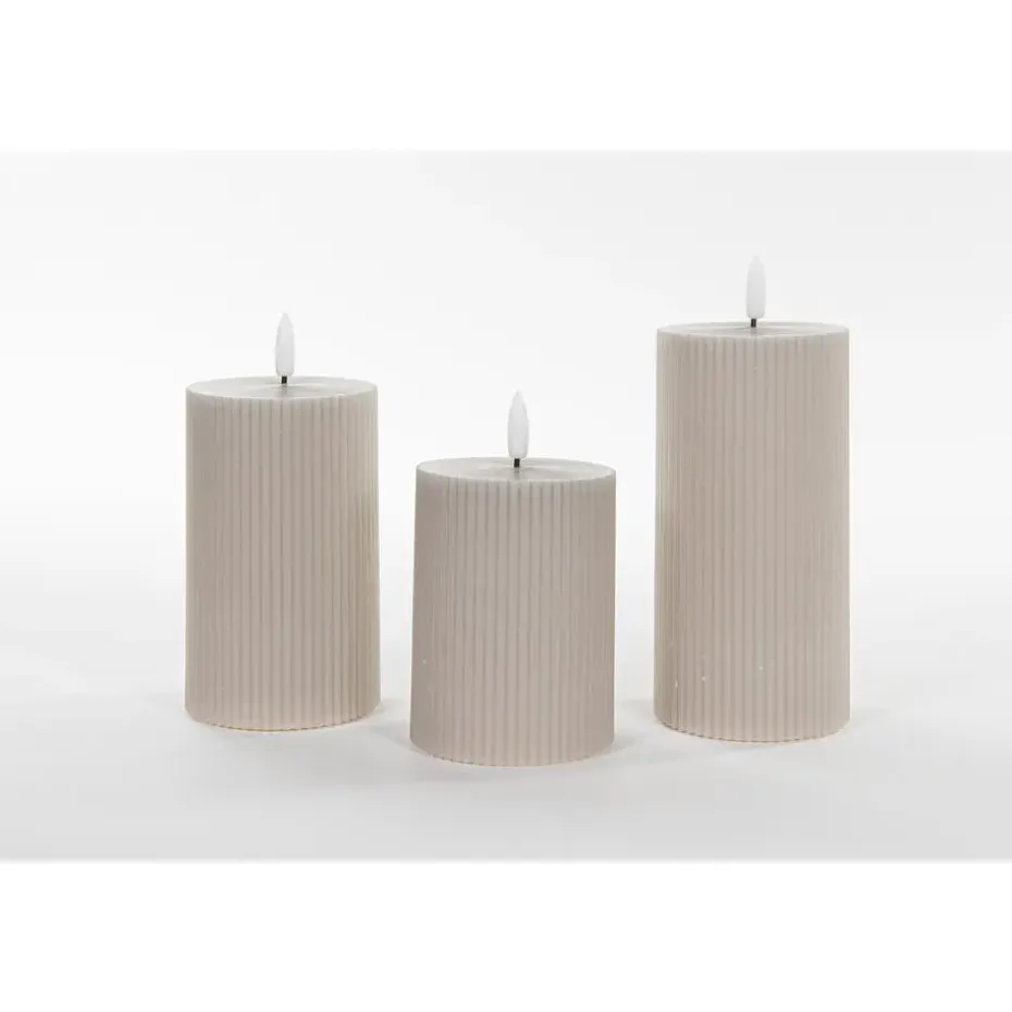 Deze LED kaarsen/stompkaarsen set is een perfecte toevoeging aan elke kamer. De set bestaat uit 3 stuks kaarsen in de kleuren taupe grijs, met een ribbel decoratie. De kaarsen zijn uitgerust met LED licht waardoor ze een warm, sfeervol licht geven. Ze zijn veilig omdat ze geen hitte geven en geen wax morsen. De LED kaarsen zullen een perfecte decoratie zijn in elke kamer en zullen een prachtig accent toevoegen aan elke tafel. Formaat kaarsen: 7,5 x 10, 7,5 x 12,5 en 7,5 x 15 cm. Voeding per kaars: 3 AAA batterij (niet inbegrepen). – Inclusief afstandsbediening- warm wit licht- mooie ribbel afwerking