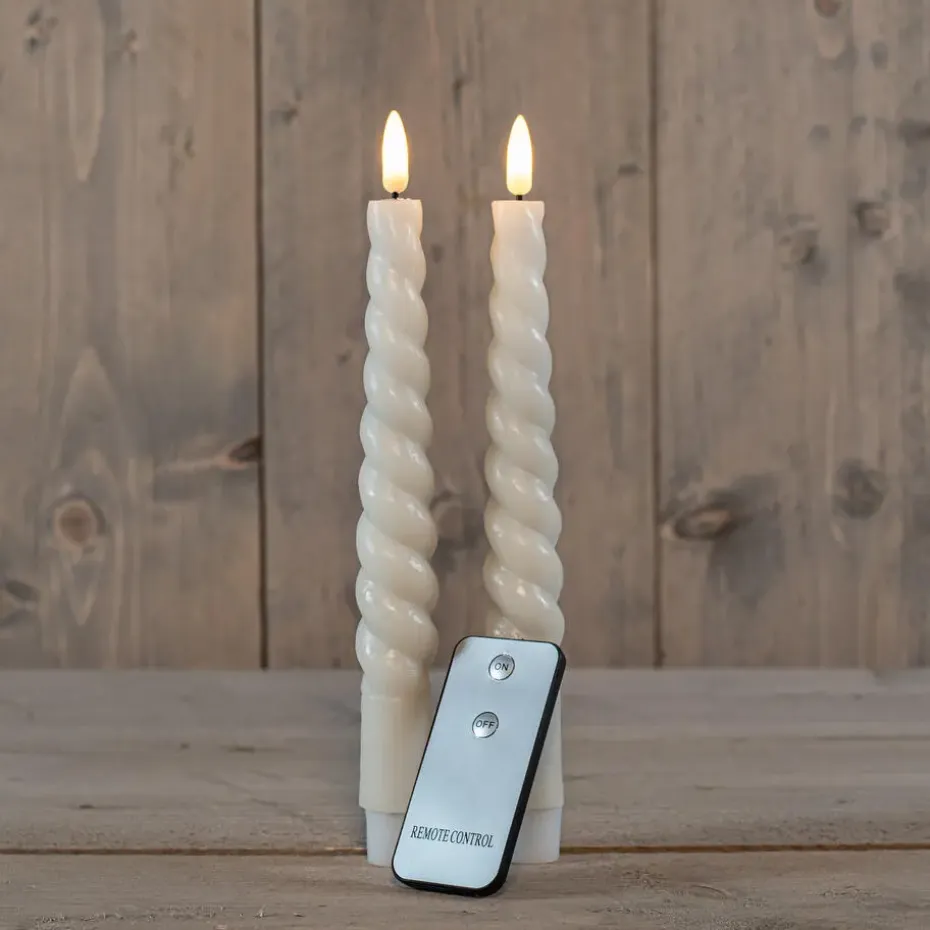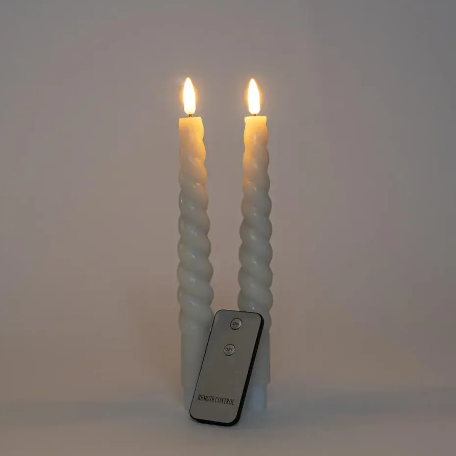 Deze swirl LED dinerkaarsen zijn de perfecte accessoire voor op tafel. Deze set bestaat uit 2 kaarsen in de kleur ivoor/creme, elk gemaakt van wax. Met een lengte van 23 cm zullen deze kaarsen perfect staan op elke tafel. De kaarsen kunnen worden bediend met een afstandsbediening, waardoor je de verlichting makkelijk kunt aan/uit zetten. Voeding per kaars: 2 AAA batterijen (niet inbegrepen). – Mooie swirl textuur- 3D vlam- luxe uitstraling- inclusief afstandsbediening