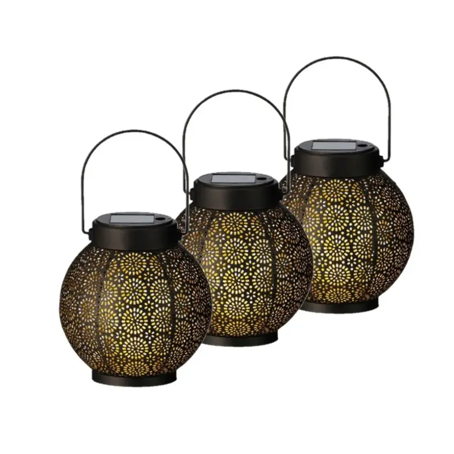 Solar lantaarn tuinverlichting met cirkel patroon. De verlichting werkt op zonne-energie waardoor het zichzelf oplaadt gedurende de dag. U kunt de lantaarn neerzetten of ophangen aan het metalen handvat voor een gezellige sfeer in de tuin, bijvoorbeeld op tafel of aan houders voor hangplanten. Formaat: 14 x 14 x 16 cm. Kleur licht: warm wit. Kleur lamp: zwart. Materiaal: metaal.