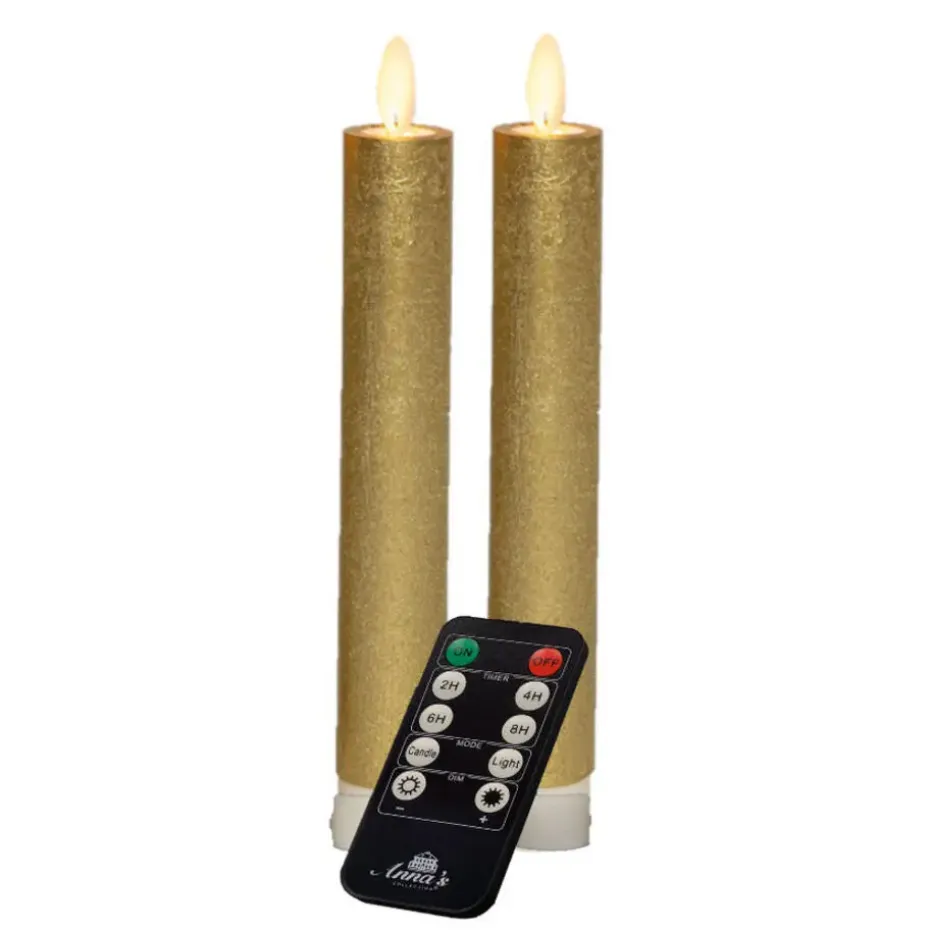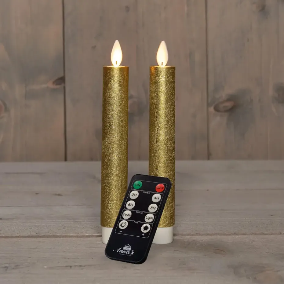 LED dinerkaarsen 2x stuks van 18 cm. Voeg een vleugje luxe toe aan je diner met deze set van 2x stuks dinerkaarsen in de kleur goud. Met een hoogte van 18 cm en LED bewegende vlam, zorg je voor een warme en elegante sfeer. Gemakkelijk te bedienen met de meegeleverde afstandsbediening, inclusief dimmer en timer functie. 2 AA batterijen per kaars worden niet meegeleverd. Laat de betovering van kaarslicht zonder zorgen om open vuur je tafel verfraaien met deze stijlvolle LED dinerkaarsen.