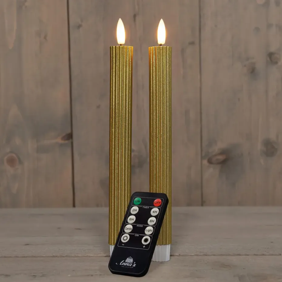 Set van 2 gouden LED dinerkaarsen met ribbelstructuur van Anna’s Collection – 23 cm hoog*Deze set bevat 2 LED dinerkaarsen in een elegante gouden kleur met een rustieke ribbelafwerking. De kaarsen zijn circa 23 cm hoog en stralen een warme, sfeervolle gloed uit zonder open vlam. Ze werken op 2 AA batterijen per kaars (niet inbegrepen) en worden geleverd met een afstandsbediening waarmee je de timer- en dimmerfuncties kunt bedienen. Veilig en stijlvol, perfect voor elke feestelijke gelegenheid.