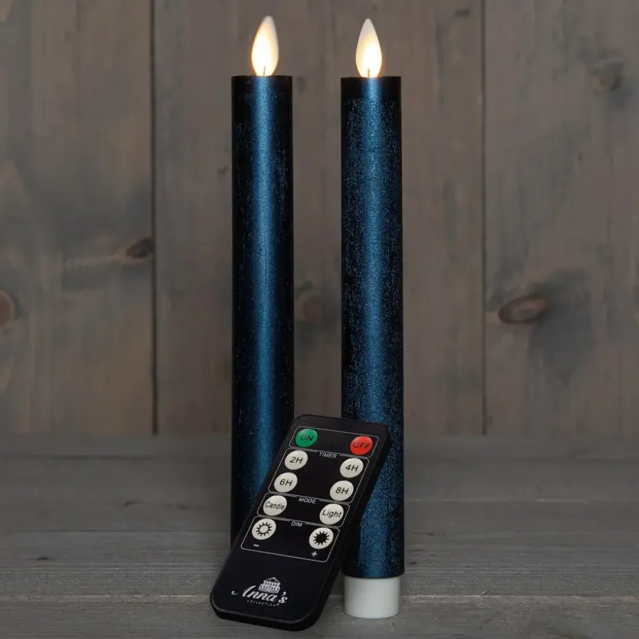 LED dinerkaarsen van 23 cm. Voeg een gezellig sfeer toe aan je diner met deze dinerkaarsen in de kleur metallic blauw. Met een hoogte van 23 cm en LED bewegende vlam, zorg je voor een warme en elegante sfeer. Gemakkelijk te bedienen met de meegeleverde afstandsbediening, inclusief dimmer en timer functie. 2 AA batterijen per kaars worden niet meegeleverd. Laat de betovering van kaarslicht zonder zorgen om open vuur je tafel verfraaien met deze stijlvolle LED dinerkaarsen.