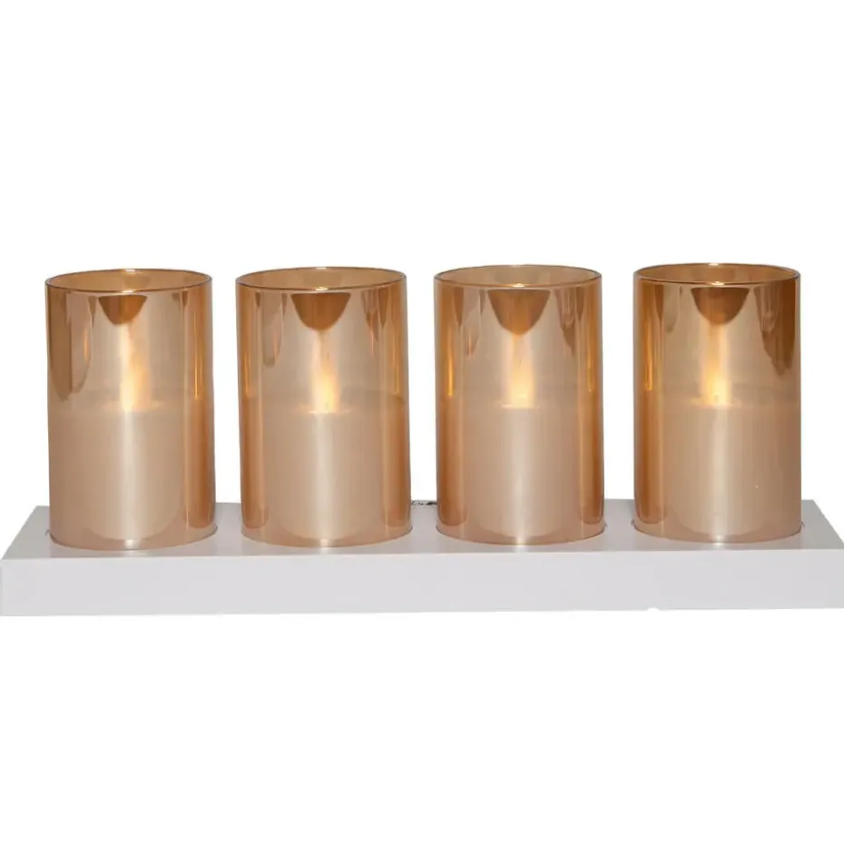 Oplaadstation standaard met 4x stuks LED kaarsen in glazen kaarsenhouders. Creeer een warme en sfeervolle ambiance met deze set van LED kaarsenhouders in oranje/amberkleurig glas. De set wordt geleverd met een oplaadstation en een handige afstandsbediening. De LED theelichten zijn oplaadbaar, waardoor je geen losse batterijen nodig hebt. De stijlvolle glazen houders hebben een formaat van 7,5 x 5 cm per stuk, perfect voor elke tafelsetting, feest of gezellige avond thuis.