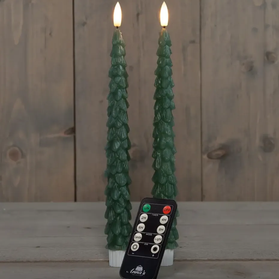 LED kaarsen/dinerkaarsen in kerstboom vorm. Set van 2x stuks kaarsen in de kleur groen. Met een hoogte van 27 cm en aangedreven door 2×2 AAA batterijen per kaars (niet inbegrepen), voegen ze een elegante gloed toe zonder open vuur. De meegeleverde afstandsbediening biedt gemak met timer- en dimmerfuncties voor de perfecte sfeer.