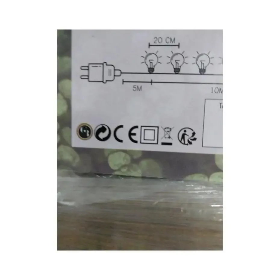 Soort verlichting: LED. Kleur licht: multi color. Kleur snoer: zwart. Totale lengte lichtsnoer: 15 meter. Lengte snoer met lampjes: 10 meter. Aantal lampjes: 50. Lengte aanloopsnoer: 5 meter. Formaat per lampje: diameter 2,5 cm. IP44 spatwaterdicht. Aansluiten op een geaard stopcontact wordt aangeraden.