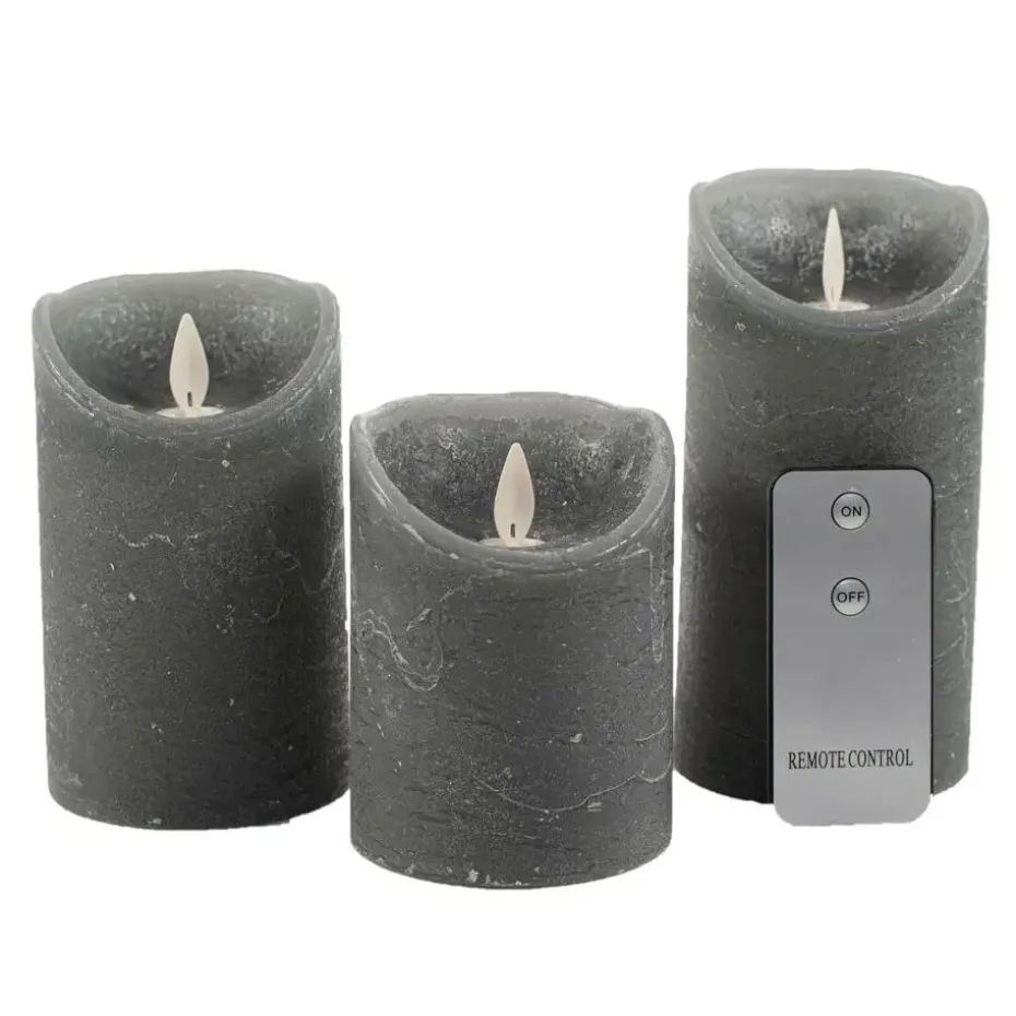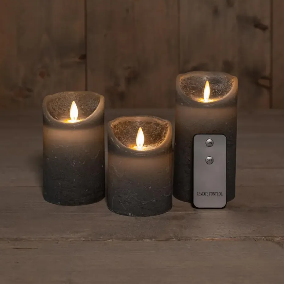 Kaarsen set van 3x stuks LED stompkaarsen in de kleur grijs. Deze set van rustieke LED stompkaarsen zijn gemaakt van echt wax en hebben een bewegende vlam, waardoor ze nauwelijks te onderscheiden zijn van echte kaarsen. Ideaal voor een veilige en sfeervolle verlichting in elke kamer.