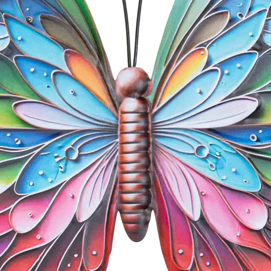 Wanddecoratie vlinder voor buiten in een prachtige kleurenmix voor aan de muur, wand of schutting. Fleur je tuin op met de decoratieve muurvlinder. Eenvoudig te bevestigen. Bevestigingsmateriaal niet inbegrepen. Materiaal: metaal. Afmeting: ca. 29 x 32 cm. Merk: Anna’s Collection. Buiten en tuin decoratie beelden in mooie kleuren. De vlinders hebben zeer veel mooie details.