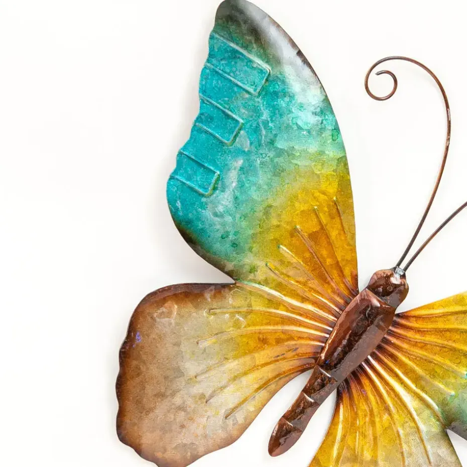 Wanddecoratie vlinder voor buiten in de kleurenmix brons/blauw voor aan de muur, wand of schutting. Fleur je tuin op met de decoratieve muurvlinder. Eenvoudig te bevestigen. Bevestigingsmateriaal niet inbegrepen. Materiaal: metaal. Afmeting: ca. 44 x 32 cm. Merk: Anna’s Collection. Buiten en tuin decoratie beelden in mooie kleuren.
