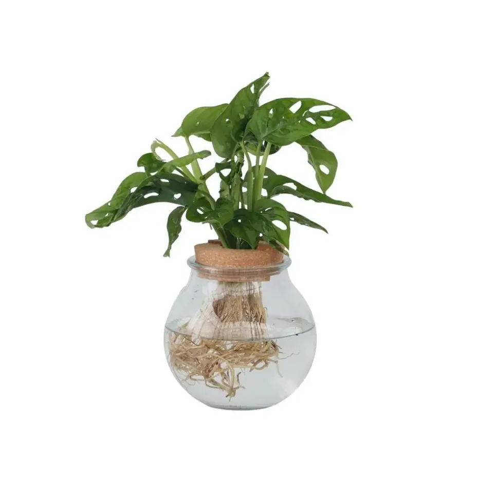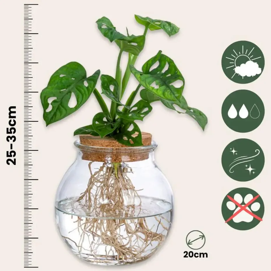 Hydrocultuur is een van de nieuwste planttrends. Hydrocultuur is een methode om planten te kweken zonder aarde, waarbij de planten al hun essentiële voedingsstoffen ontvangen via een voedingsrijke wateroplossing. Met deze techniek geniet je niet alleen van het prachtige uiterlijk van de bladeren, maar kun je ook de wortels van de plant zien groeien. Bovendien zijn hydrocultuurplanten heel gemakkelijk te onderhouden. Het enige wat u hoeft te doen is het water zo nu en dan (bij voorkeur eens in de twee weken) te verversen. Het Monstera Monkey Mask of Monstera Adansonii Monkey Mask is het hipsterbroertje van de bekendere Monstera Deliciosa. Deze hangplant is eigenzinnig en doet wat hij wil met zijn schattige gaatjes in de bladeren en eigenzinnige vormen. Deze prachtige hydrocultuurplant wordt kant-en-klaar geleverd, inclusief bolvormige glazen vaas en kurk. Het enige wat je hoeft te doen is water toevoegen. En kies natuurlijk een mooi plekje uit!