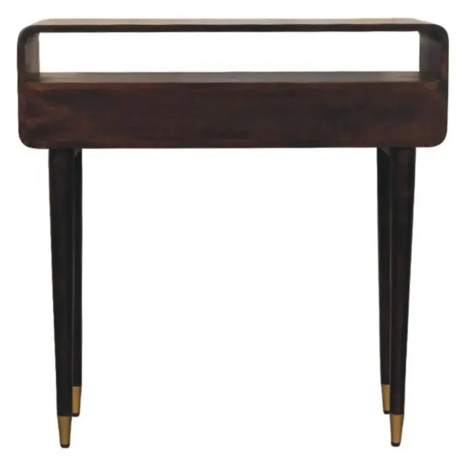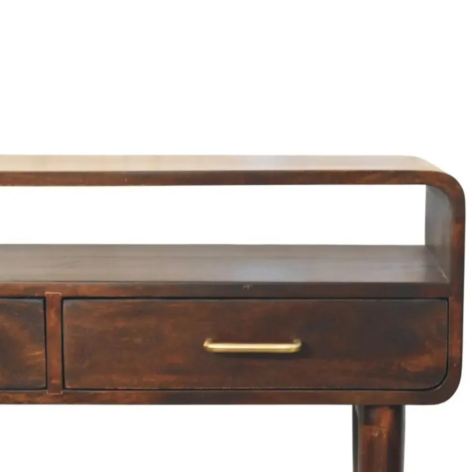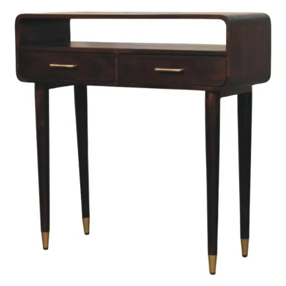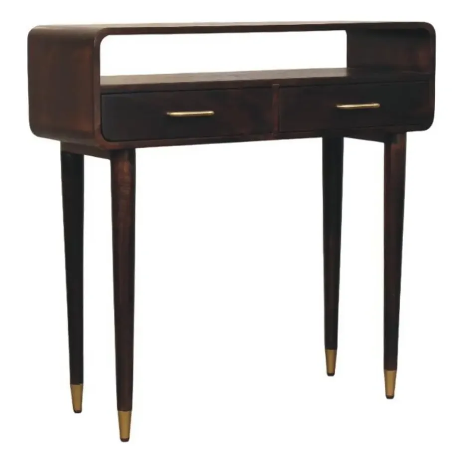 Een verfijnde samensmelting van vorm en functie – het Apollo Loop Console Bureau straalt mid-century elegantie uit met een moderne twist. Het opvallende open frame is met de hand vervaardigd uit 100% massief mangohout en rust op lange, taps toelopende poten met messing doppen voor een luxueus accent. De dubbele lades bieden precies voldoende opbergruimte, terwijl de verhoogde achterrand een sculpturale lus vormt – perfect om decoratieve objecten te presenteren of benodigdheden netjes op hun plaats te houden. Of u het nu gebruikt als schrijftafel of als console in de hal, dit meubelstuk brengt een stijlvolle uitstraling zonder te overheersen.