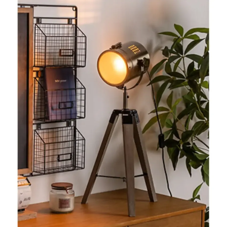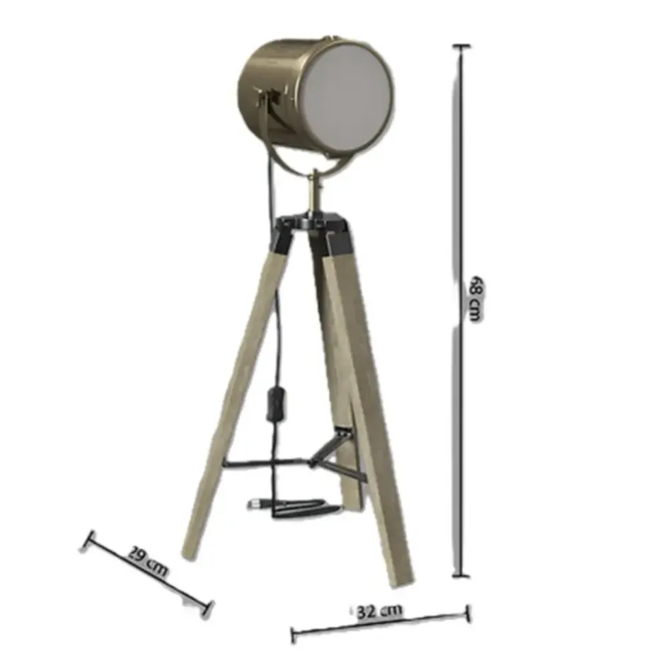 Staande lamp metaal op 3 houten poten. De lampekap is in het kleur bronze. Ideaal voor een industrieel getint interieur. Presenteert het best op een kast of bijzettafel. De lamp kan 360° draaien. De poten zijn inklapbaar.