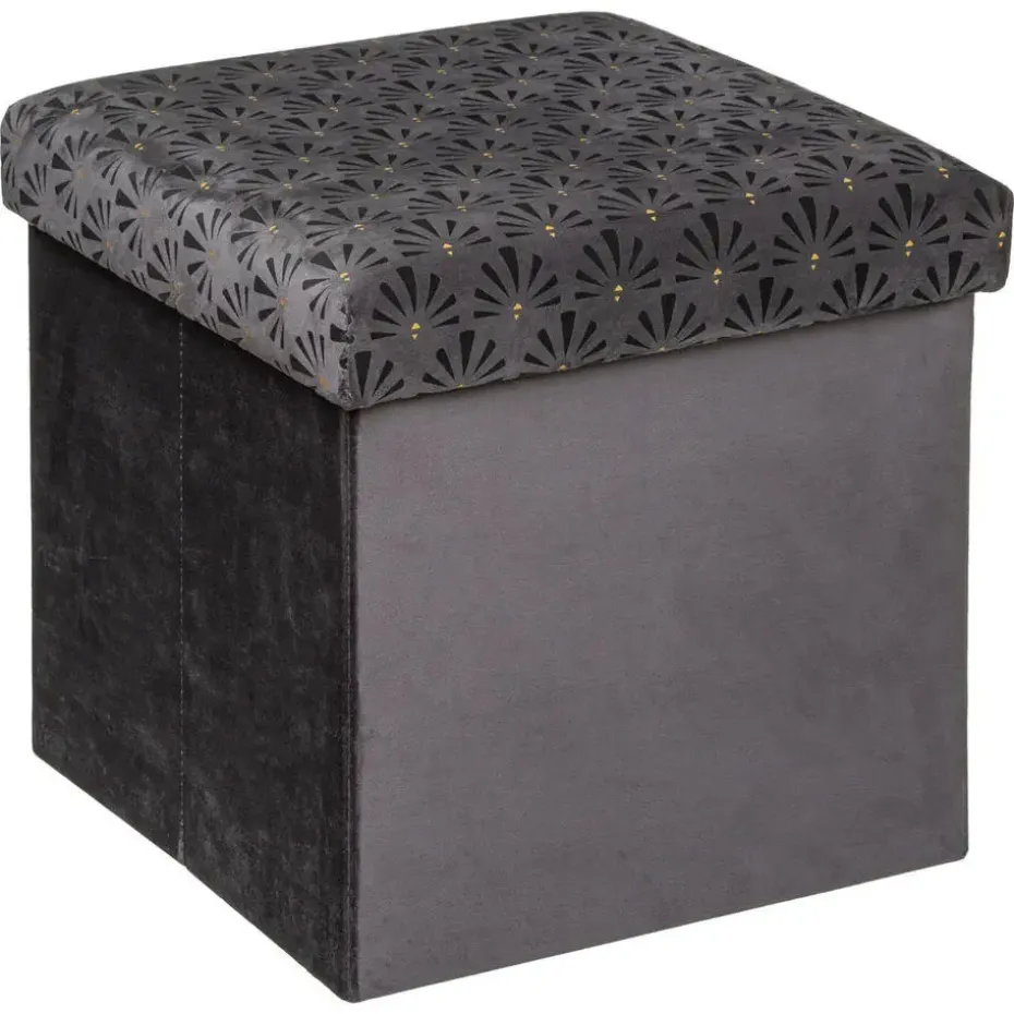 Poef/zit krukje/opslag hocker, model Royal, van een op fluweel lijkende stof, met leuke print aan de bovenzijde. De te vullen met spullen hocker is opvouwbaar tot plat en is een opslag box met deksel, waar je op kan zitten. Kleur: fluweel Donkergrijs. Materiaal: MDF en polyester stof. Afmetingen: Dia 38 x H38 cm. Gasten bijzet krukje voor als u extra zitplaatsen nodig hebt. Altijd handig om thuis te hebben staan. Geschikt voor kinderen en volwassenen. De opslagruimte is maar liefst 60 liter. Als u deze niet meer gebruikt, klapt u deze eenvoudig in, zodat het weinig ruimte inneemt. 1 persoons model.
