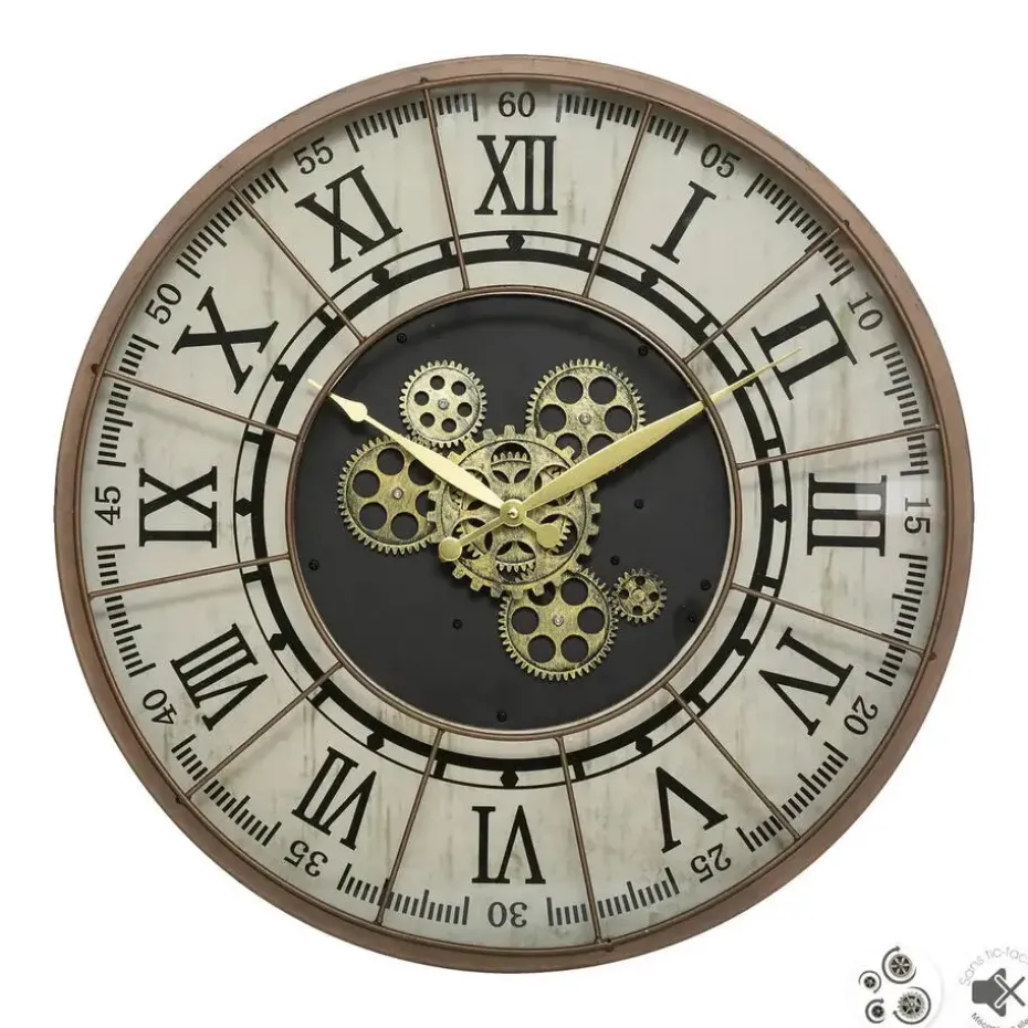 Wandklok Stella Mare Vintage Metal voor aan de muur/wand in de huis/studeerkamer met een diameter van 57 cm en dikte 7 cm. Grote klok met zichtbare en werkzame tandwielen. Kleuren: lichtbruin/transparant glas. Met Romeinse cijfers. Aan de achterkant zit een ophanging(bevestigingsmateriaal niet inbegrepen). Materiaal: metaal/kunststof/glas. Voeding: 3x AA-batterij, niet inbegrepen. Gewicht: 4 kilo. Dit klok ornament geeft meteen een fijne sfeer, met een mix van gevoelens tussen nu en toen. Mooie luxe klok, een blikvanger.