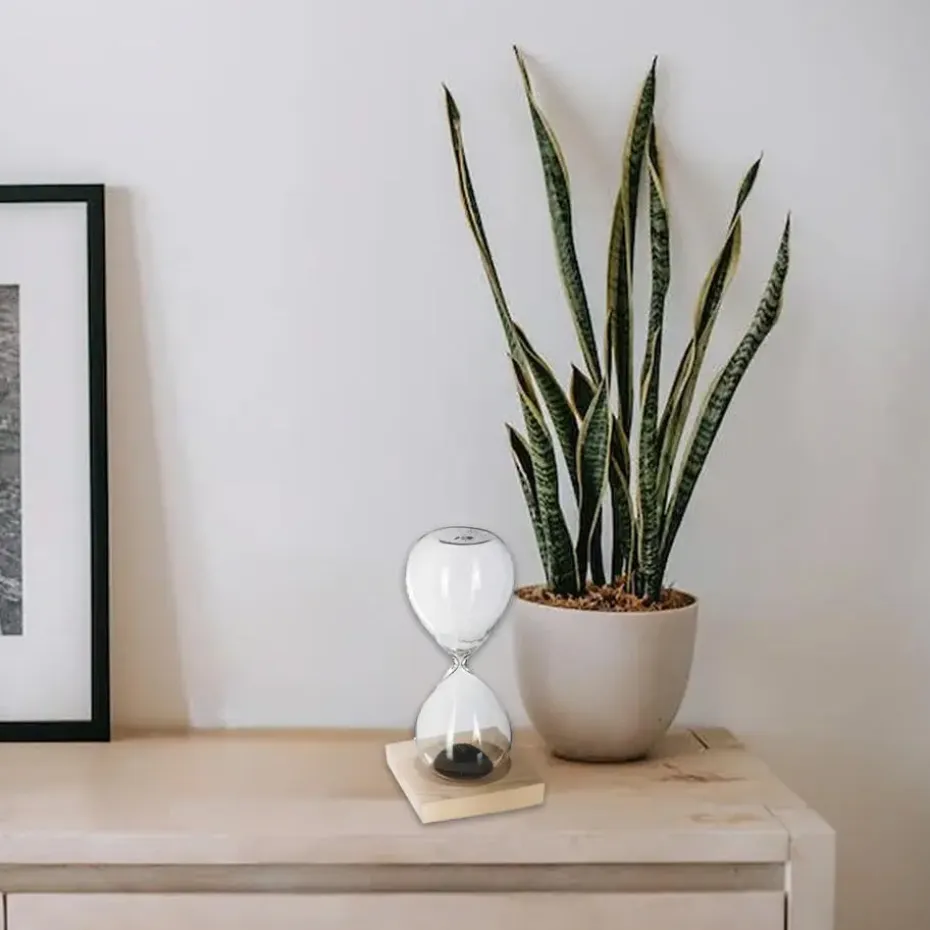 Zandloper cilinder in een luxe frame. Dit artikel kan ter decoratie of tijdsmeting gebruikt worden. Eenheid: 1 minuten zwart zand. Afmetingen: Dia 8 cm en H15 cm. Materiaal: glas/hout.