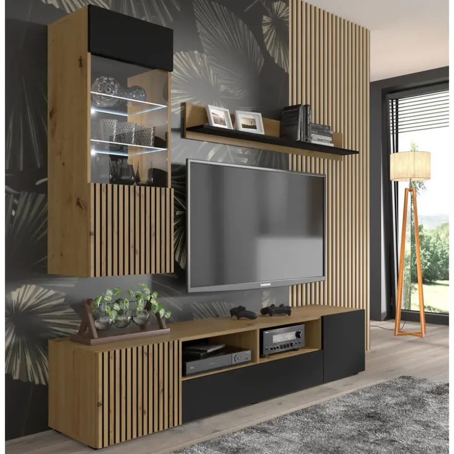 Auris is een prachtige collectie voor de woonkamer, die kenmerken van moderne, loft- en industriële stijl combineert. De meubels stralen buitengewone elegantie uit, te danken aan het gebruik van natuurlijk hout en krachtig zwart. Een opvallend kenmerk zijn de fronten in lamelvorm, vervaardigd uit hoogwaardig MDF.