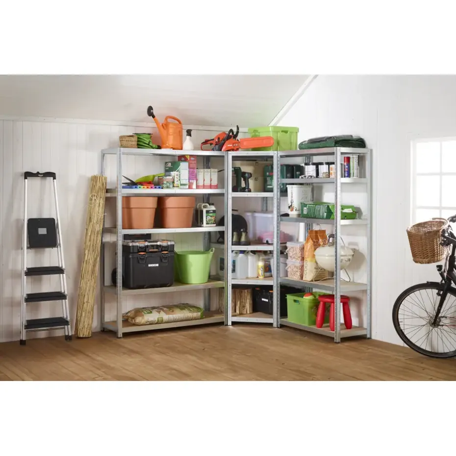 Met een hoek stellingkast maak je optimaal gebruik van de ruimte in een berging of garage. Het opbergrek leent zich er uitstekend voor om er voorraden, schoonmaakspullen en (tuin)gereedschap in op te bergen. Het stellingrek heeft 5 planken met elk een draagkracht van 175kg. De planken zijn in hoogte verstelbaar. Zo bepaal je zelf de tussenruimte tussen de schappen.