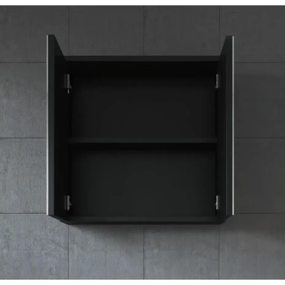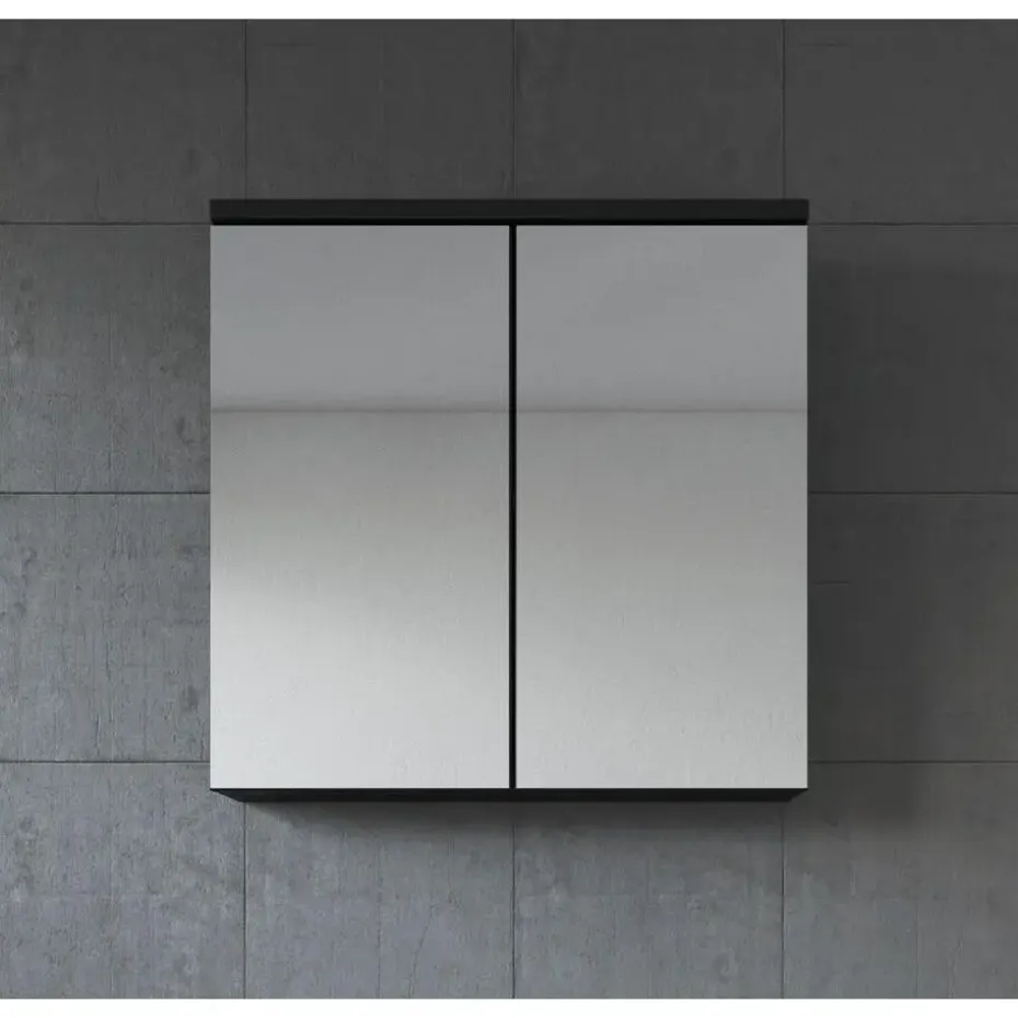Spiegelkast Toledo is een kast voor in de badkamer uitgevoerd met twee spiegeldeuren en veel bergruimte. De kast is gemaakt van hoge kwaliteit spaanplaat en vanwege zijn strakke afwerking ook makkelijk schoon te maken. De deuren van de kast zijn aan de buitenzijdes uitgevoerd met twee spiegels. De kast heeft aan de binnnekant geen spiegels. De spiegelkast is uitgevoerd in zwart.