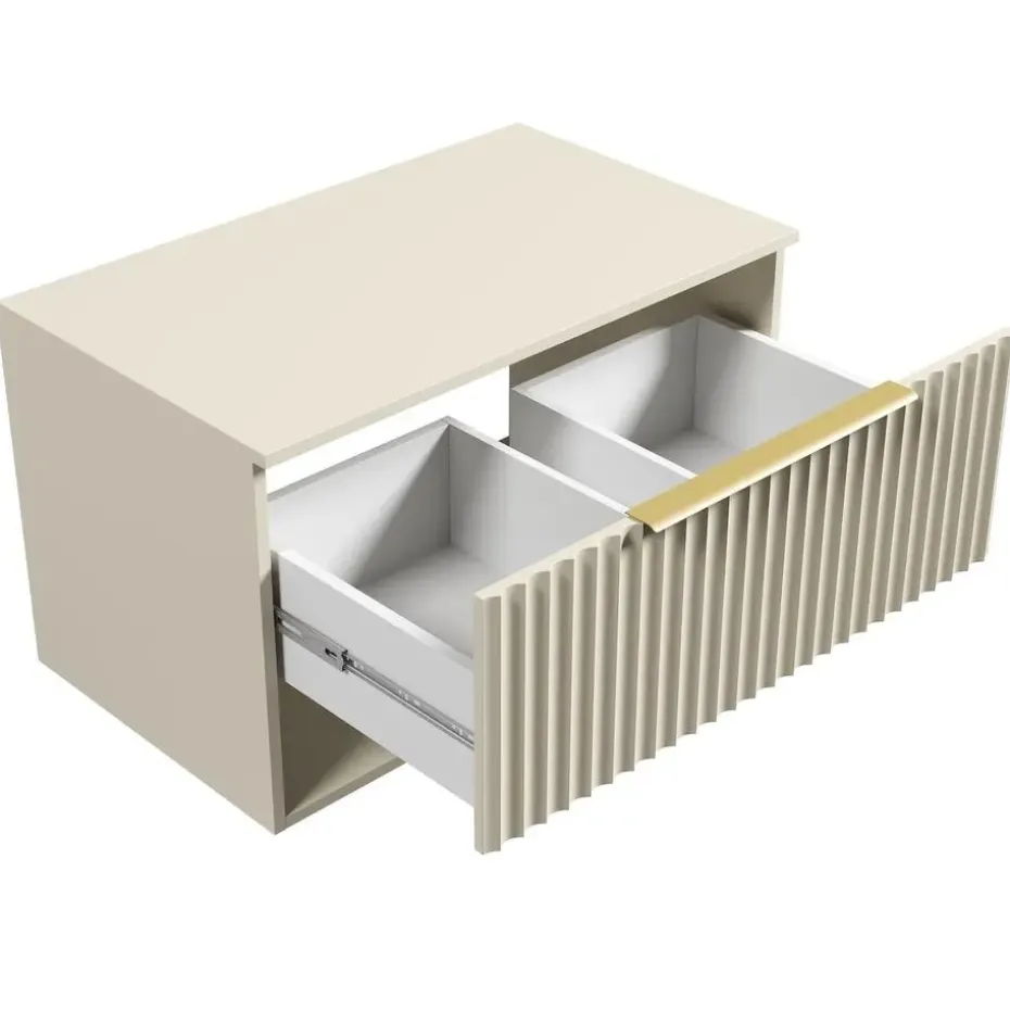 Wastafelkast Kelo is uitgevoerd met één lade, open vak en een dicht bovenblad zonder waskom. De wastafelkast moet nog worden gemonteerd.Gemaakt van hoge kwaliteit spaanplaat, met MDF ladefront. De kast is vanwege zijn strakke design eenvoudig schoon te maken.De wastafelkast is uitgevoerd in beige.