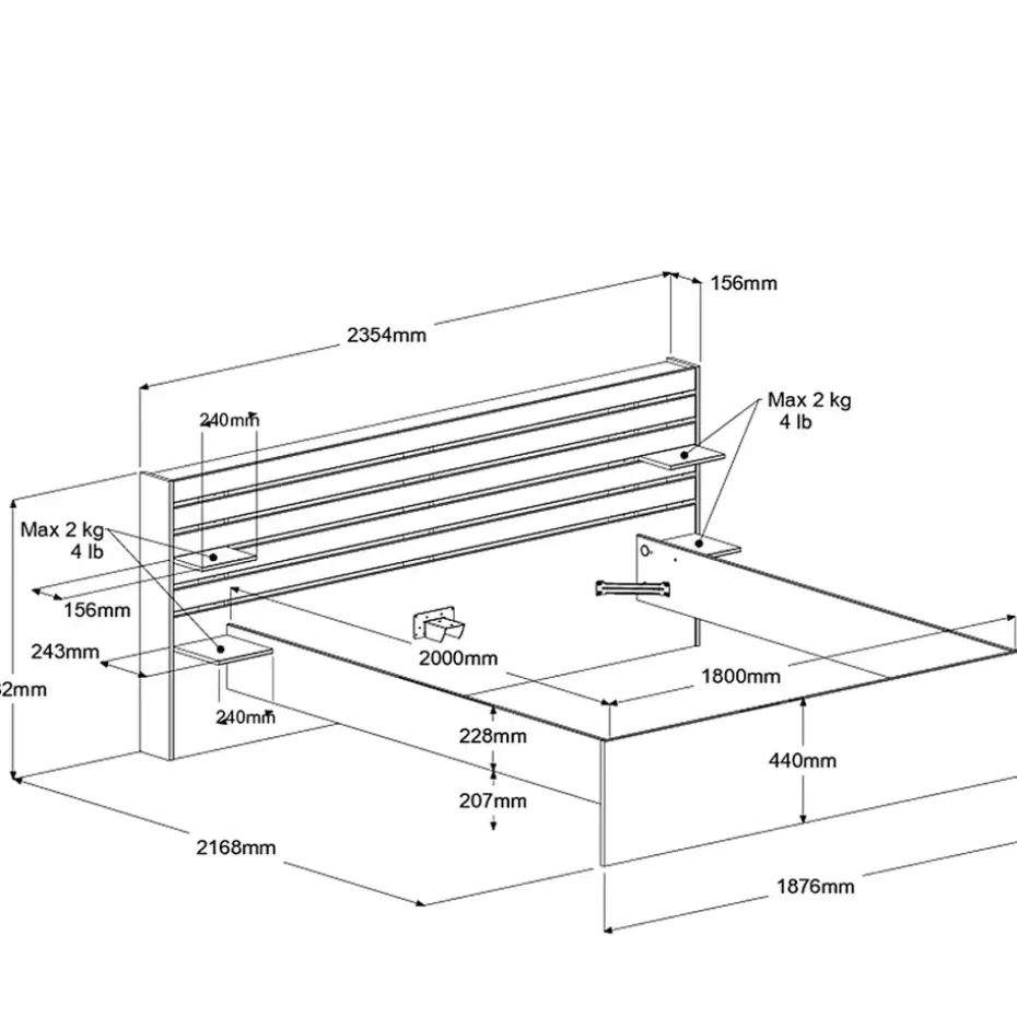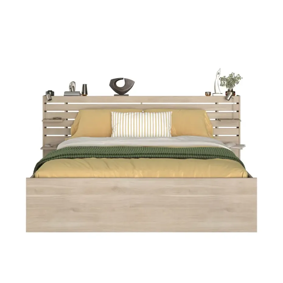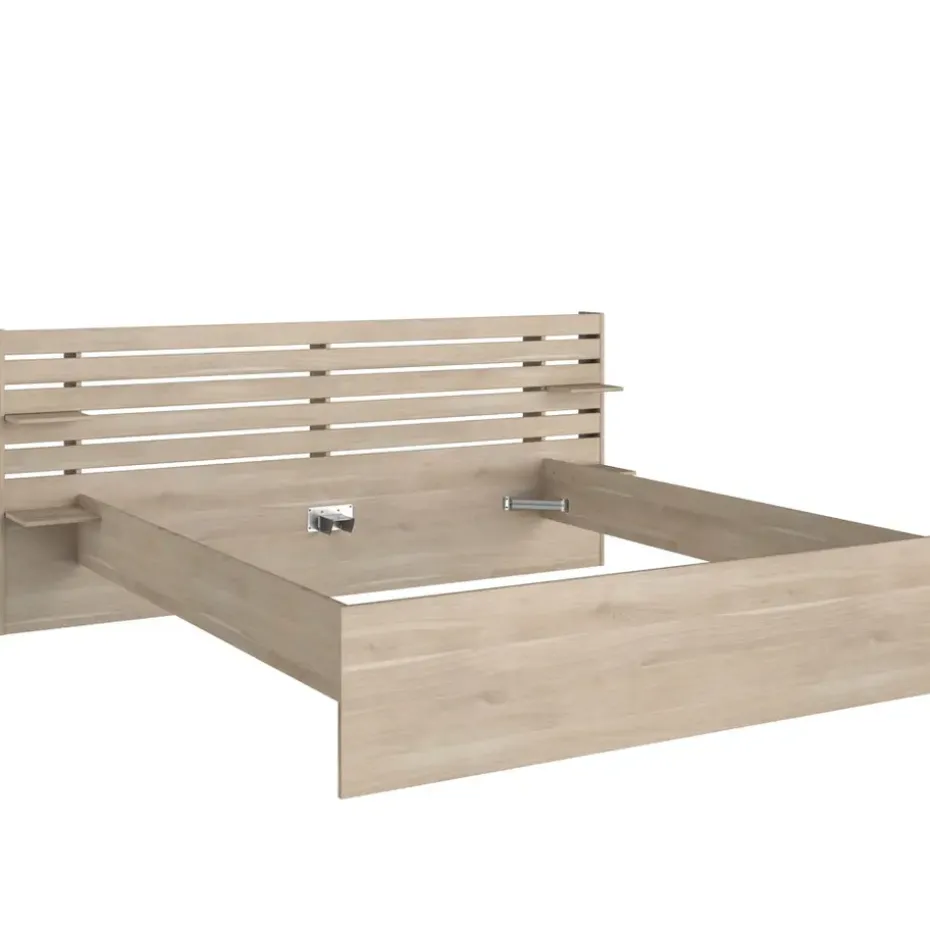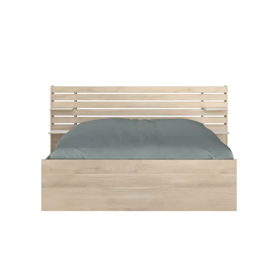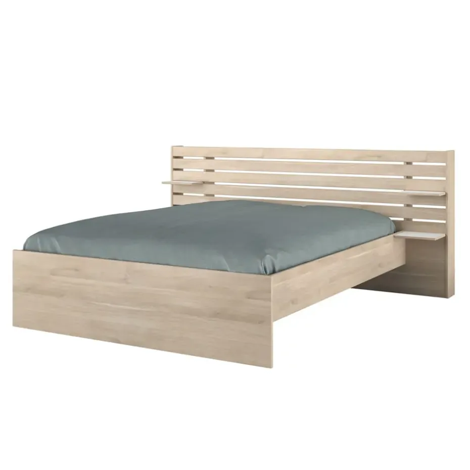 Bed Evi heeft een mooie eikenkleur en heeft een formaat van 180×200 cm, welke geschikt is voor 2 personen. Het bed heeft een extra breed hoofdbord met 4 houten plankjes, welke gebruikt kunnen worden om belangrijke spulletjes op te zetten of om decoratie op te plaatsen. Dit 2-persoonsbed wordt geleverd zonder lattenbodem en matras.