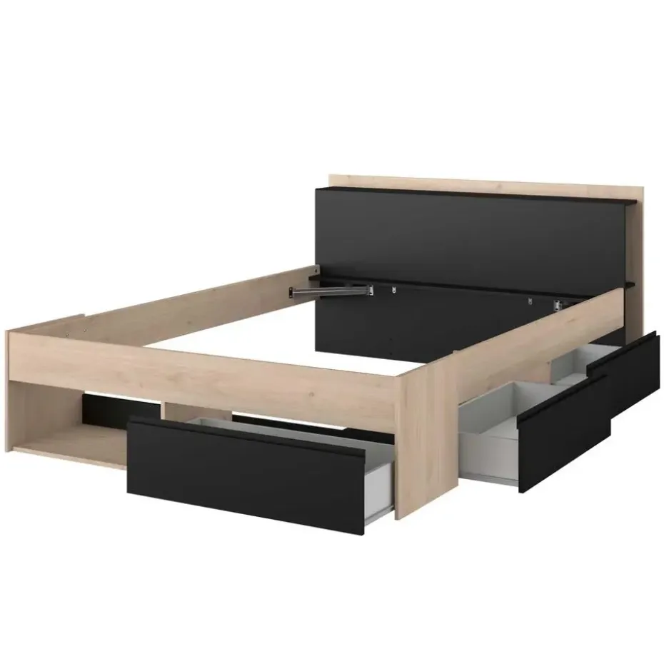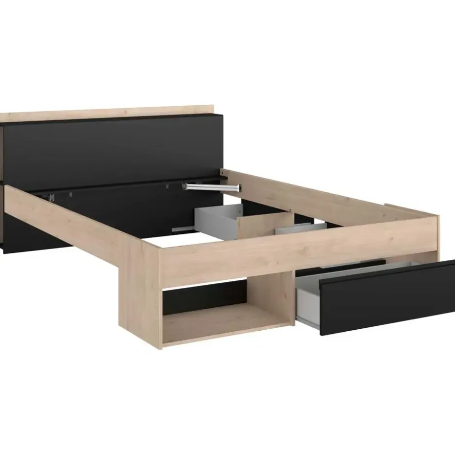 Dit moderne 2-persoonsbed geeft jouw slaapkamer meteen een andere dimensie. Bovendien biedt dit bed in eikdecor met zwarte accenten heel wat opbergmogelijkheden (3 inbegrepen lades & verschillende opbergvakken). De lades aan de zijkant kan je zowel aan de linker- of rechterzijde monteren.