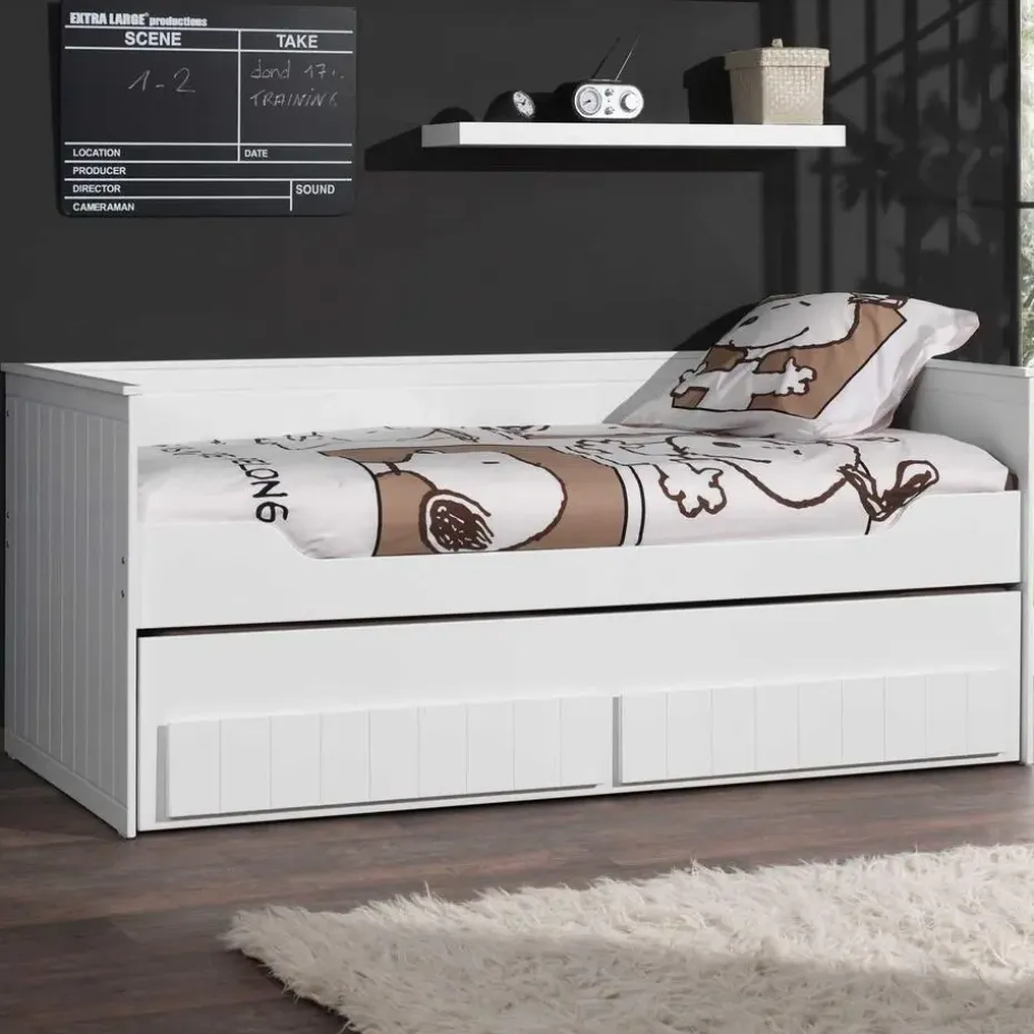 Creëer een cosy sfeer in de kinderkamer met de moderne bedbank Robin! Dit kinderbed is gemaakt uit hoogwaardig MDF en heeft een sneeuwwit decor. De extra troeven van dit bed? Naast een bedlade zijn er ook nog 2 lades inbegrepen. Heel handig als extra opbergruimte en als logeerbed! Het rolbed is geschikt voor een matras van 90×200 cm met een maximale dikte van 15cm. De sobere look en de fijne lijnen passen perfect in de stijl van deze kinderkamer.