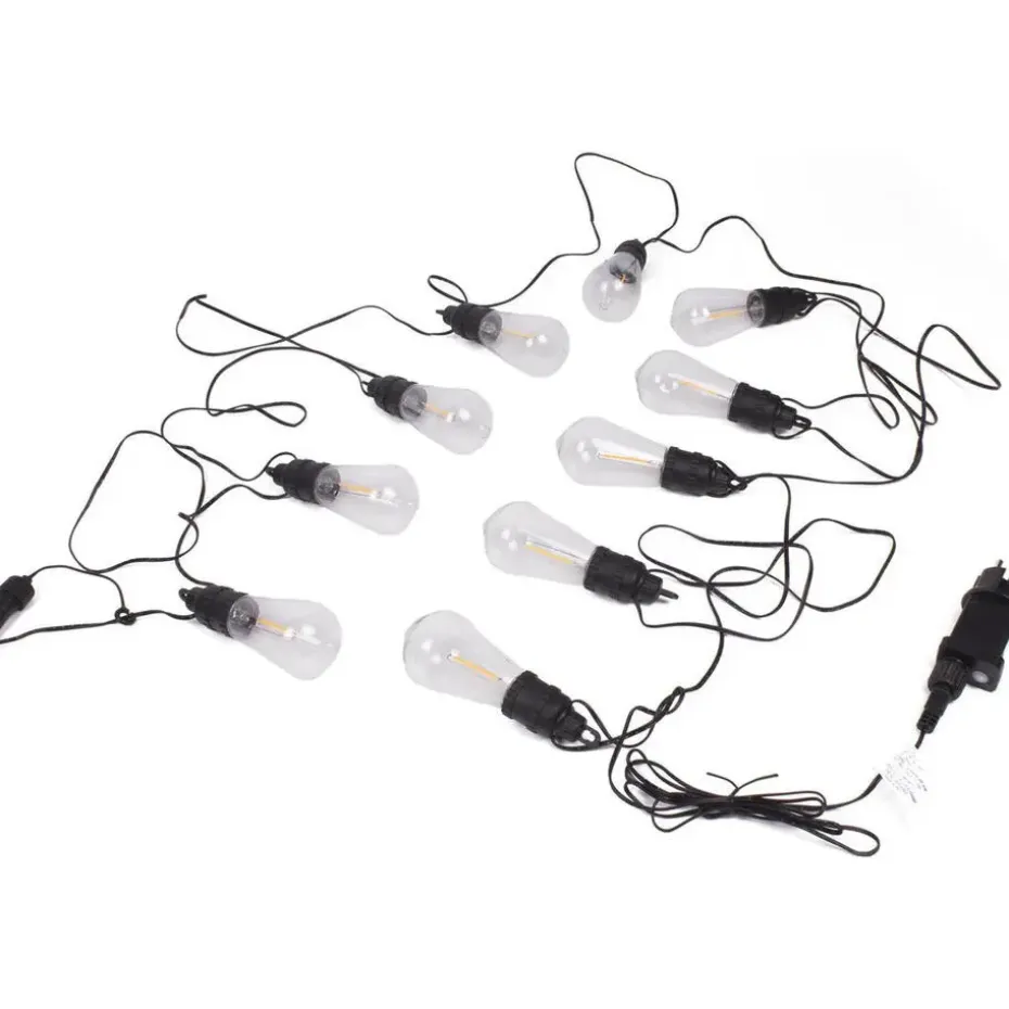 De 10 heldere S14-lampen verspreiden een zachte, uitnodigende gloed en zijn verdeeld over een zwarte kabel van 7 meter. Dankzij de IP44-transformator kun je het snoer veilig buiten gebruiken, zolang de adapter zelf binnen blijft. De ingebouwde timer schakelt het licht automatisch 6 uur aan en 18 uur uit, wat handig en energiezuinig is.