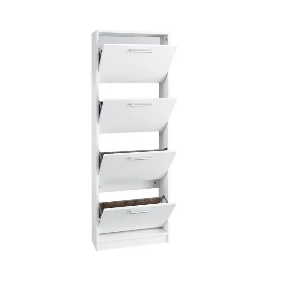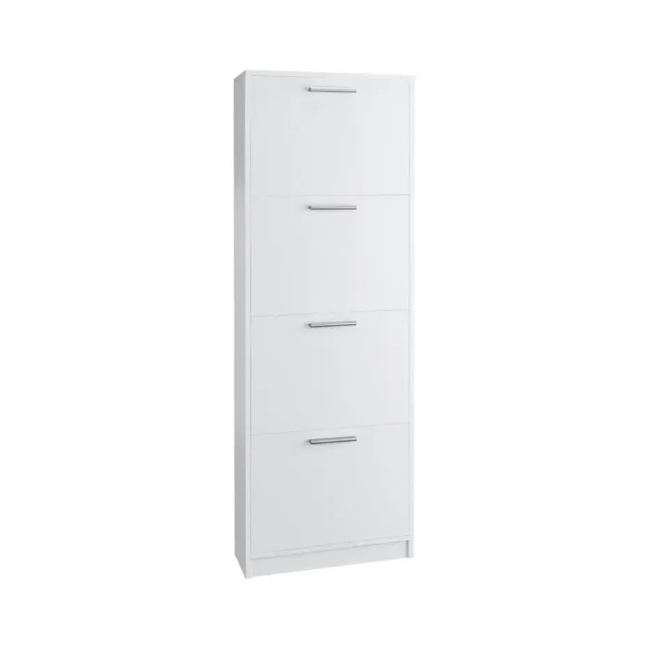 Biedt veel opbergruimte voor uw schoenen terwijl het weinig ruimte inneemt. De schoenenkast met 4 draaideuren heeft een modern design. Chique stanggrepen en sobere kleuren bepalen de look. Met zijn eigentijdse uitstraling kan de schoenenkast worden gecombineerd met een grote verscheidenheid aan interieurstijlen. Het is uitgerust met meerdere draaideuren waarachter veel ruimte is. U kunt er netjes sneakers, pantoffels en sandalen in opbergen. Voor de productie van de schoenenkast worden stabiele materialen gebruikt. Een verrijking voor uw gang, de schoenenkast met modern design.
