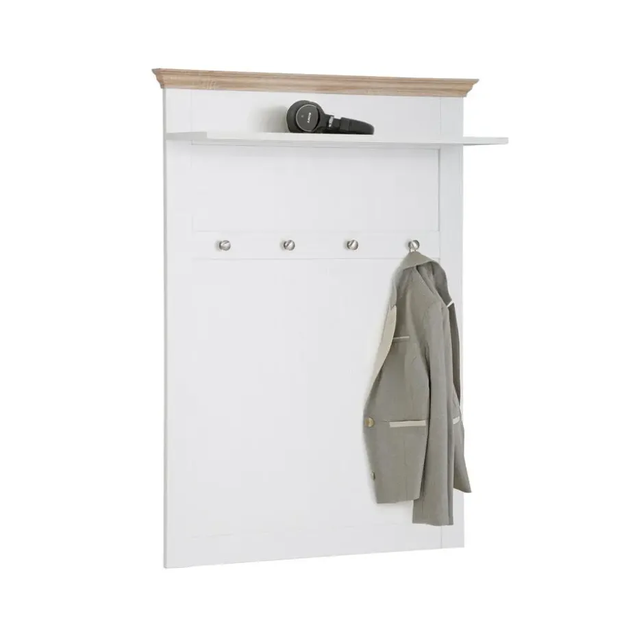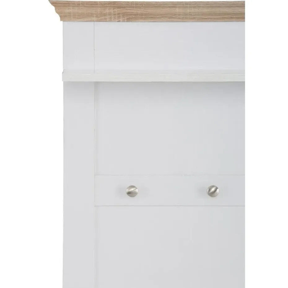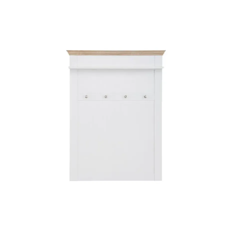 De wandkast is een modern kastpaneel in landelijke stijl. Met zijn chique houtlook en tactiele structuur creëert hij een natuurlijke en comfortabele entree. De hangende kapstok is een vriendelijke uitnodiging voor je gasten en familie om jassen, jacks, sjaals en meer op te hangen. Er zijn vier tijdloos mooie haken beschikbaar. De plank biedt precies de juiste hoeveelheid ruimte voor petten of hoeden. Dit aantrekkelijke entree-element is gemaakt van FSC®-gecertificeerd hout.