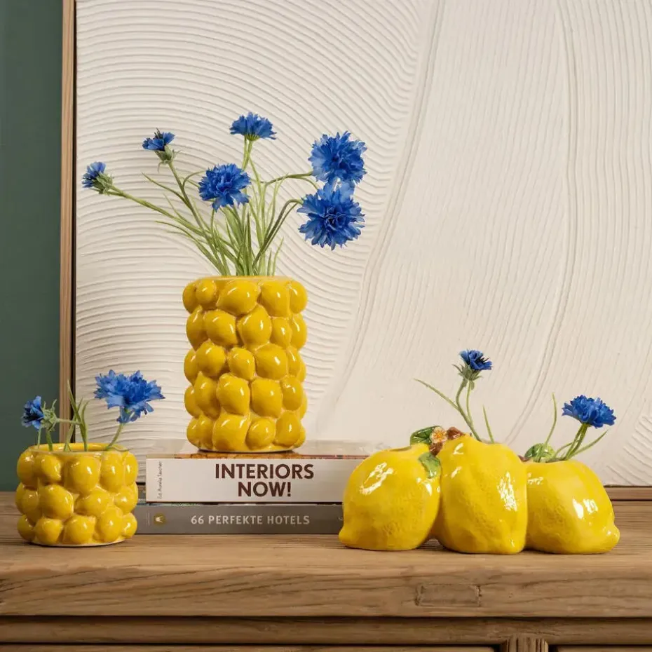Deze prachtige keramische bloemenvaas met een speels citroenenpatroon is een echte blikvanger in elk interieur. Met zijn levendige gele kleur en gedetailleerde fruitdesign voegt deze vaas een frisse en vrolijke uitstraling toe aan je woonkamer, keuken of eettafel. Dankzij de afmetingen van Ø12 x H19 cm is hij perfect voor een bos bloemen of als decoratief item op zichzelf. Gemaakt van hoogwaardig keramiek, combineert deze fruitvaas stijl met duurzaamheid. Een ideale keuze voor liefhebbers van unieke en kleurrijke woonaccessoires!