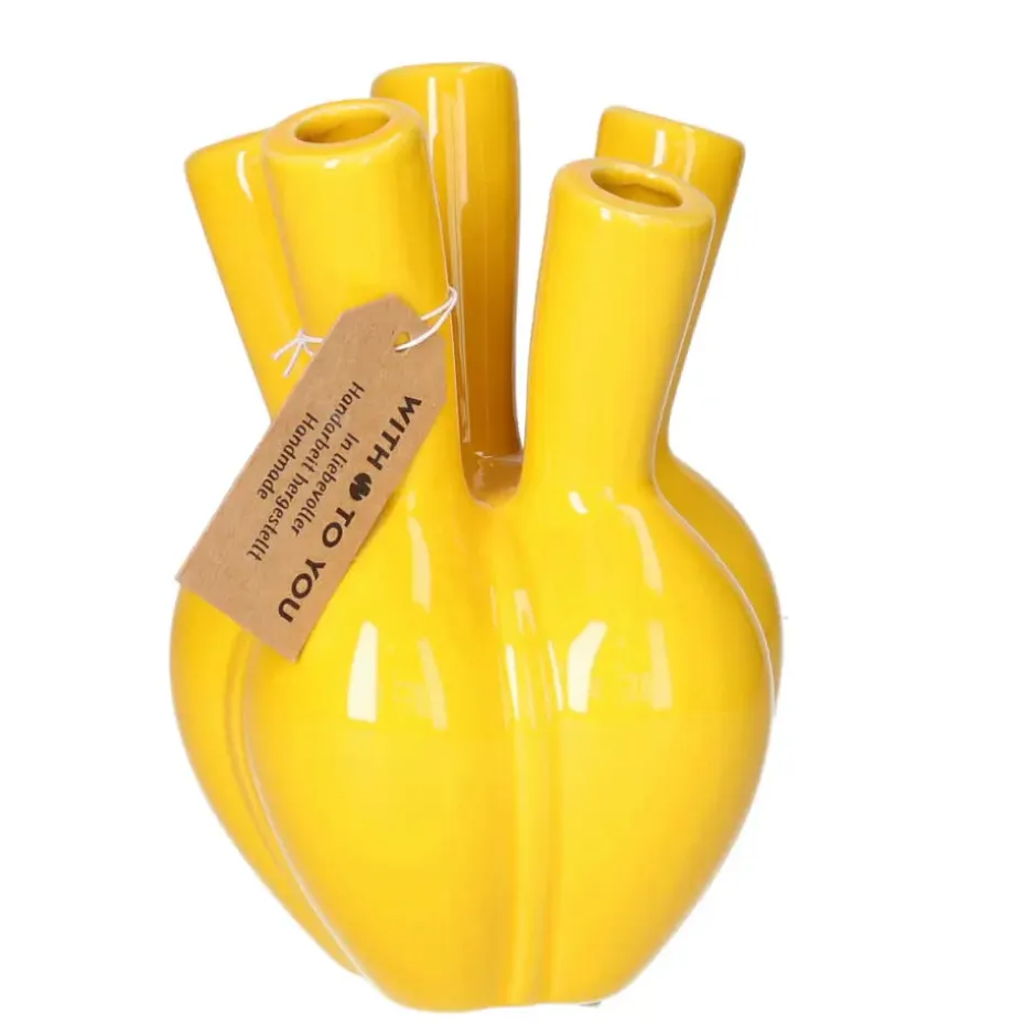 Bloemenvaas/tulpenvaas in de kleur geel. Deze prachtige vaas is uitstekend te gebruiken om tulpen in te schikken, maar ook voor andere bloemen. Misstaat ook zeker niet zonder bloemen als decoratief object voor binnen gebruik. Met zijn speelse design is deze toetervaas een aanvulling op ieder interieur, en past in iedere woonstijl. Leuk om cadeau te geven voor bijvoorbeeld Moederdag. Formaat: 12 x 18 x 12 cm. Materiaal: Keramiek.