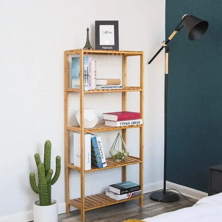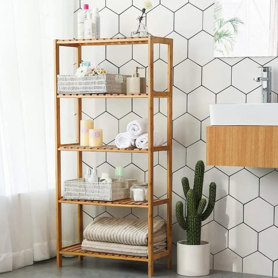De bamboe componenten van dit rek zijn niet alleen natuurlijk en duurzaam, maar zorgen ook voor een stijlvolle uitstraling in je badkamer. De metalen onderdelen zijn roestvrij, waardoor ze bestand zijn tegen vochtige omgevingen.