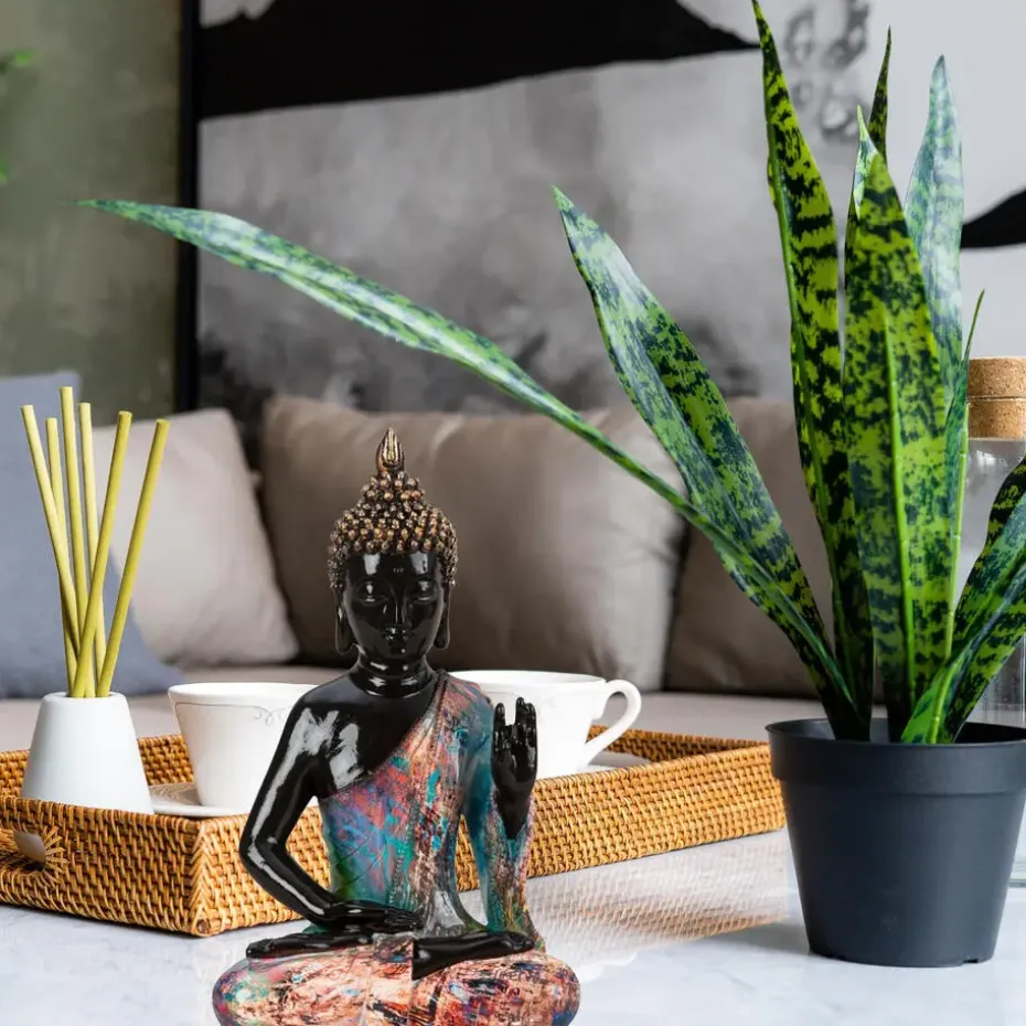 Boeddha beeld - binnen/buiten - kunststeen - zwart - 18 x 31 cm