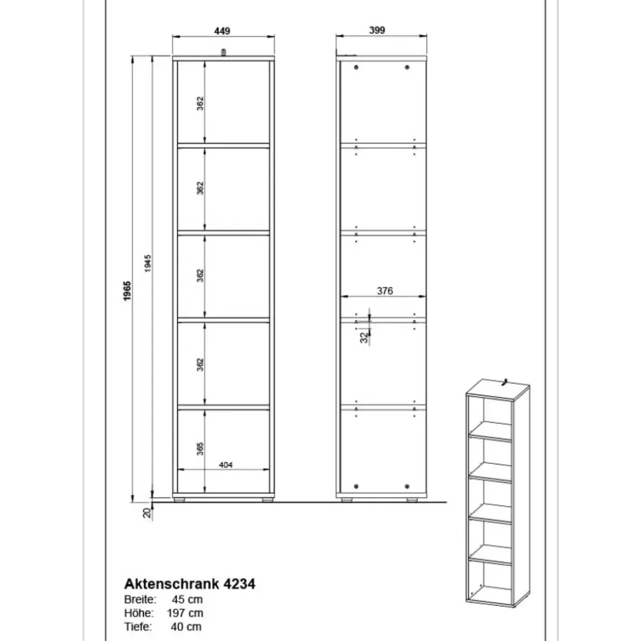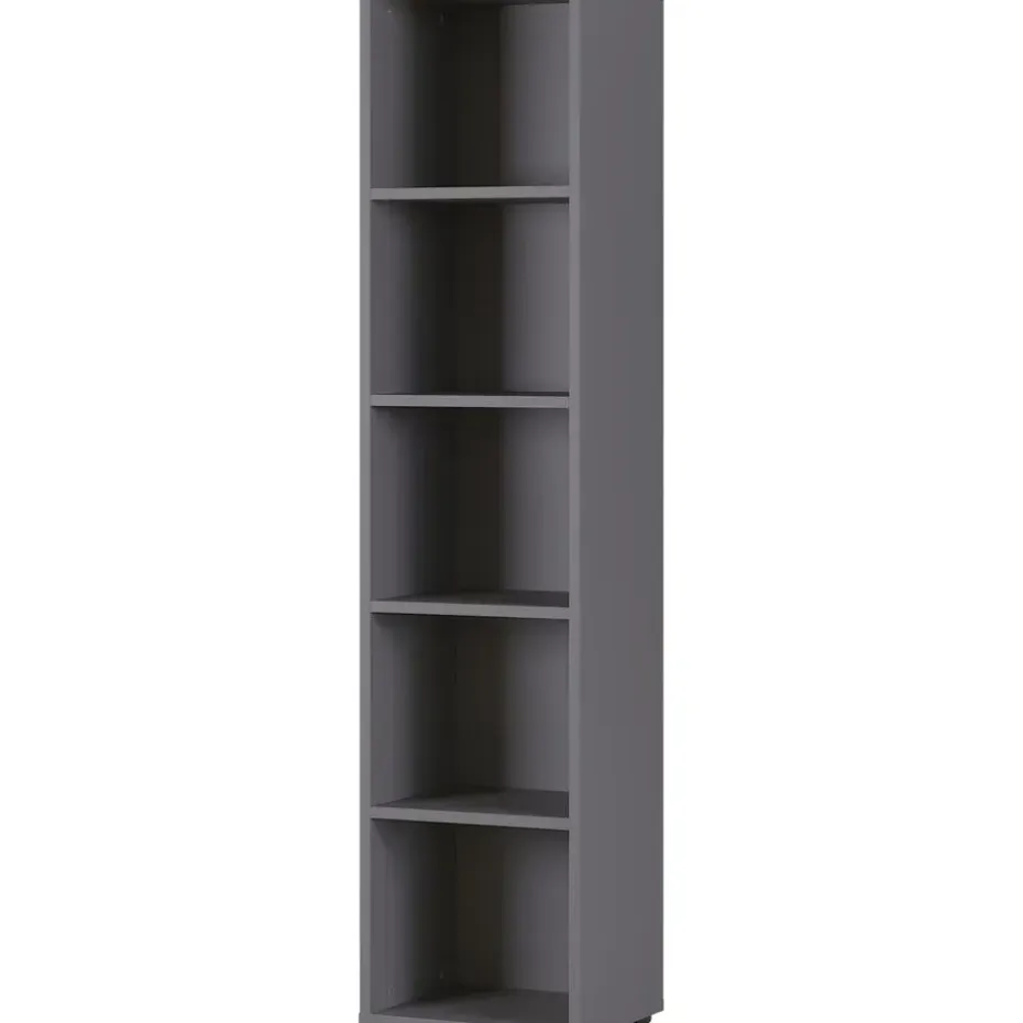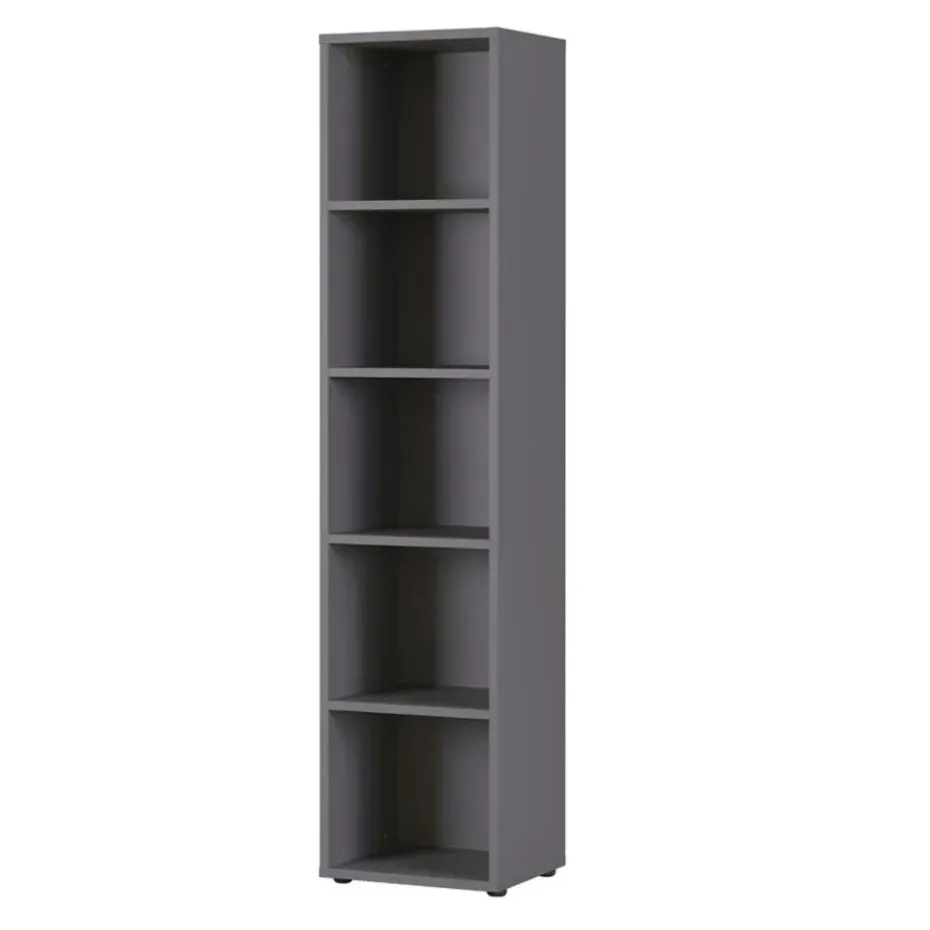 Deze smalle grafietgrijze boekenkast van de Osmond-collectie telt 5 open vakken. De 4 legplanken zijn elk verstelbaar in de hoogte. Installeer deze boekenkast in jouw kantoor, in de woonkamer of zelfs in de kinderkamer en berg er al jouw boeken en documenten netjes in op.
