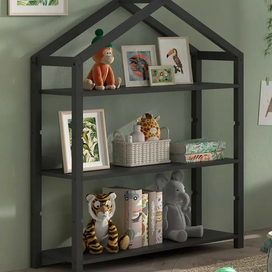 Op zoek naar een boekenrekje voor de kinderkamer met een stijlvol, minimalistisch design? Dan zal dit Dallas-boekenrek je zeker bekoren. Het speelse rek in de vorm van een huisje is gemaakt uit duurzaam massief dennenhout in antraciet. Het compacte ontwerp en twee verstelbare legplanken maken dit rekje ideaal om boekjes, speelgoed en allerlei andere spulletjes uit te stallen. Ontdek ook onze leuke bedhuisjes uit de Dallas-reeks op de website.