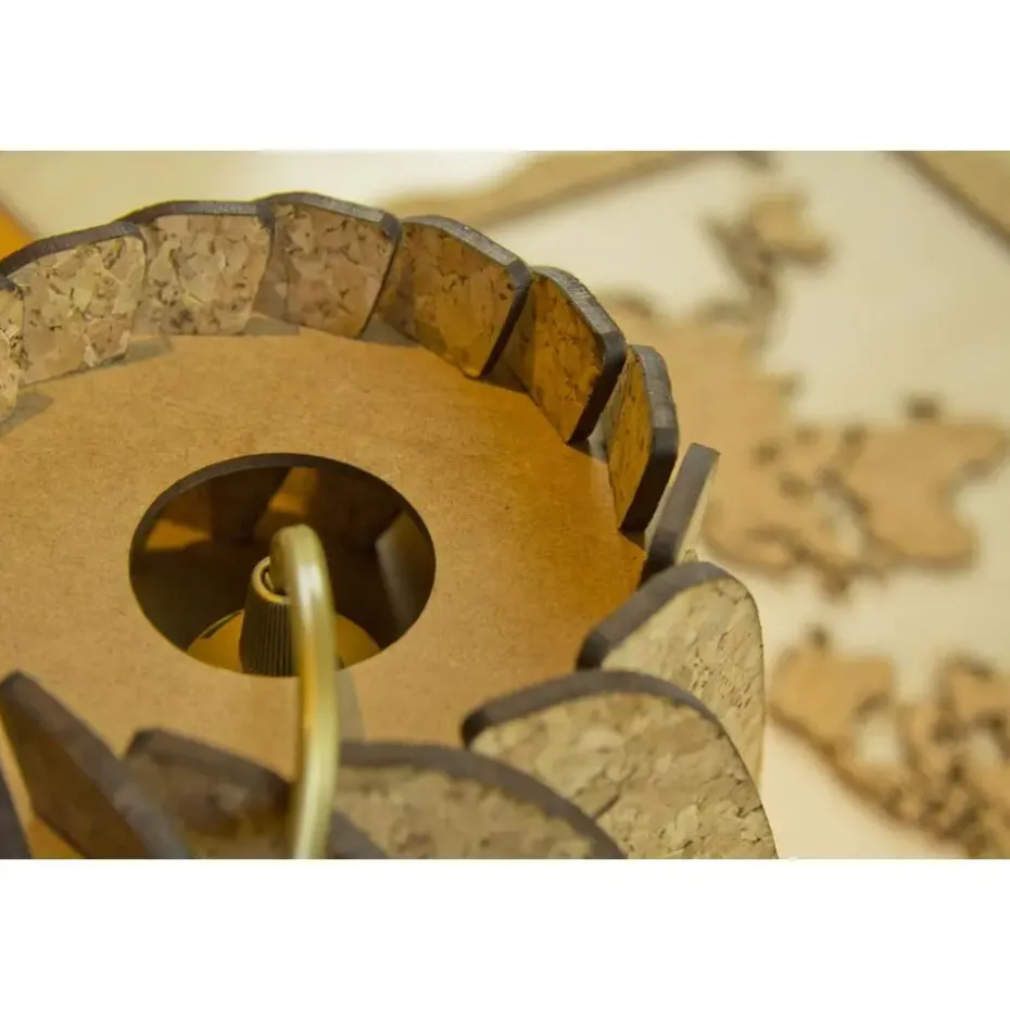 Deze zijn bekleed met kurk en worden stuk voor stuk in het frame geschoven. Hierdoor wordt er een ruimtelijk raster gecreëerd dat een heel bijzonder lichteffect geeft. De boemerangs worden met een kleine hoek geplaatst, waardoor een speciaal ontwerp ontstaat. Je kunt de Bomerango lamp gebruiken als tafellamp of als hanglamp. Je kunt dus zelf bepalen wat het leukst in jouw interieur past. De Spin lamp is verkrijgbaar in vier maten: S, M, L en XL.