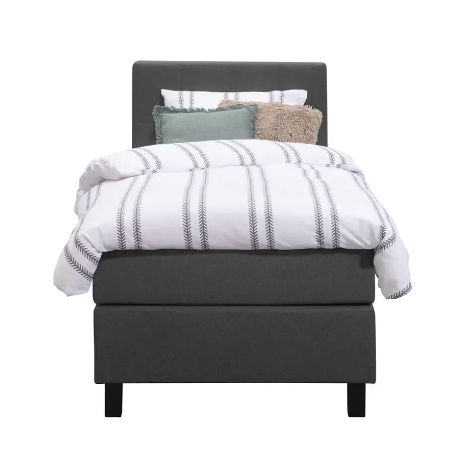 Boxspring Liv is een boxspring met een afmeting van 90×200 cm. Deze prachtige boxspring is bekleed met een grof geweven antraciete stof en heeft een landelijke uitstraling met een geblokt hoofdbord. De Liv geblokt is uitgerust met een pocketveringmatras en daarnaast ook nog een koudschuim topdekmatras voor extra comfort. Het pocketveringmatras is omkeerbaar, bestaande uit zowel een medium- als een stevige kant. Hierdoor kun je zelf kiezen wat voor jou het meest comfortabel ligt.
