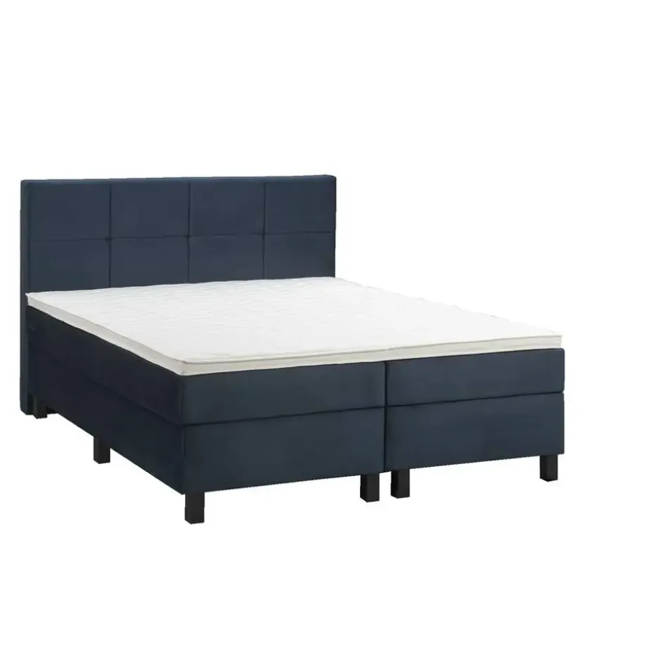 Boxspring Liv is een boxspring met een afmeting van 160×200 cm. Deze prachtige boxspring is bekleed met een velvet blauwe stof en heeft een landelijke uitstraling met een geblokt hoofdbord. De Liv geblokt is uitgerust met twee pocketveringmatrassen en daarnaast ook nog een koudschuim topdekmatras voor extra comfort. Het pocketveringmatras is omkeerbaar, bestaande uit zowel een medium- als een stevige kant. Hierdoor kun je zelf kiezen wat voor jou het meest comfortabel ligt.