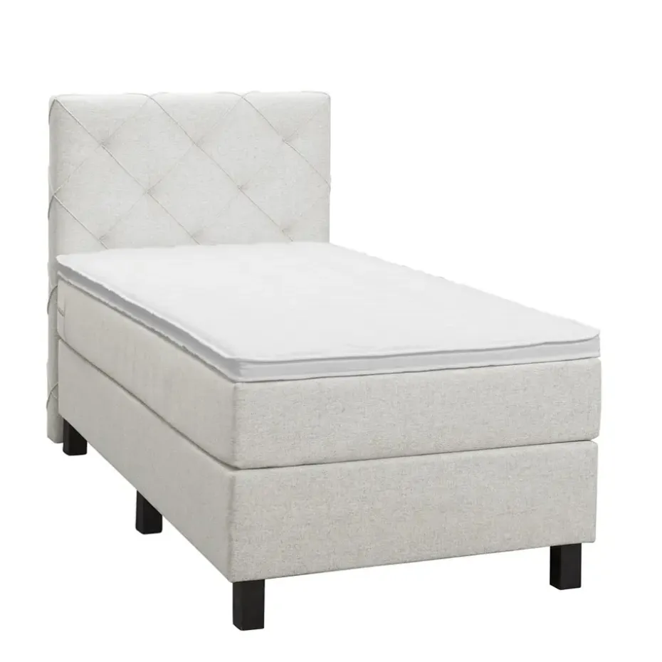 Boxspring Liv is een boxspring met een afmeting van 90×200 cm. Deze prachtige boxspring is bekleed met een fijn geweven ecru stof en heeft een romantische uitstraling met een geruit hoofdbord. De Liv geruit is uitgerust met een pocketveringmatras en daarnaast ook nog een koudschuim topdekmatras voor extra comfort. Het pocketveringmatras is omkeerbaar, bestaande uit zowel een medium- als een stevige kant. Hierdoor kun je zelf kiezen wat voor jou het meest comfortabel ligt.