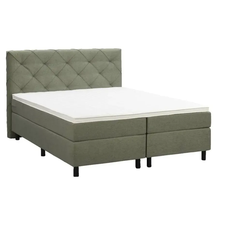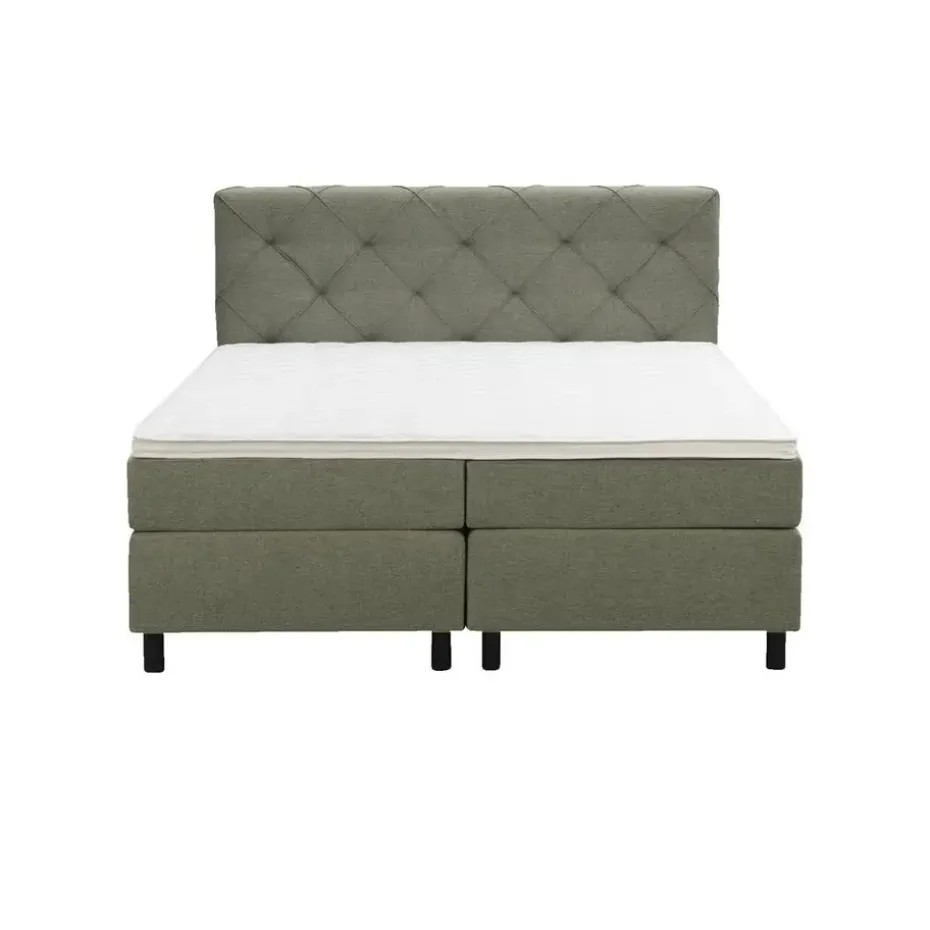 Boxspring Liv is een boxspring met een afmeting van 160×200 cm. Deze prachtige boxspring is bekleed met een fijn geweven groene stof en heeft een romantische uitstraling met een geruit hoofdbord. De Liv geruit is uitgerust met twee pocketveringmatrassen en daarnaast ook nog een koudschuim topdekmatras voor extra comfort. Het pocketveringmatras is omkeerbaar, bestaande uit zowel een medium- als een stevige kant. Hierdoor kun je zelf kiezen wat voor jou het meest comfortabel ligt.